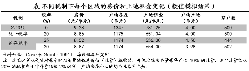 Case和Grant[8]基于这一理论,在1991年进行了数值模拟,他们发现,如果全国采取统一税率,提高房地产税的确将使得房价下跌、住房消费减少,在他们的测算里,如果从不征收到征收2%的房地产税,房价将下降4.5%左右。而当各地房地产税率不同,有的地区税率较高,有的地区税率较低时,情况又略有不同。高税率地区的房价下跌、消费减少,这和之前的情况是一致的,但是高税率地区减少购买的消费者会发生流动,这一挤出效应反而相对推高了低税率地区的房价,使得低税率地区的房价下降幅度更小。延伸来说,房地产税作为资本税,对高价的、作为投资性消费的房屋价格影响更大。