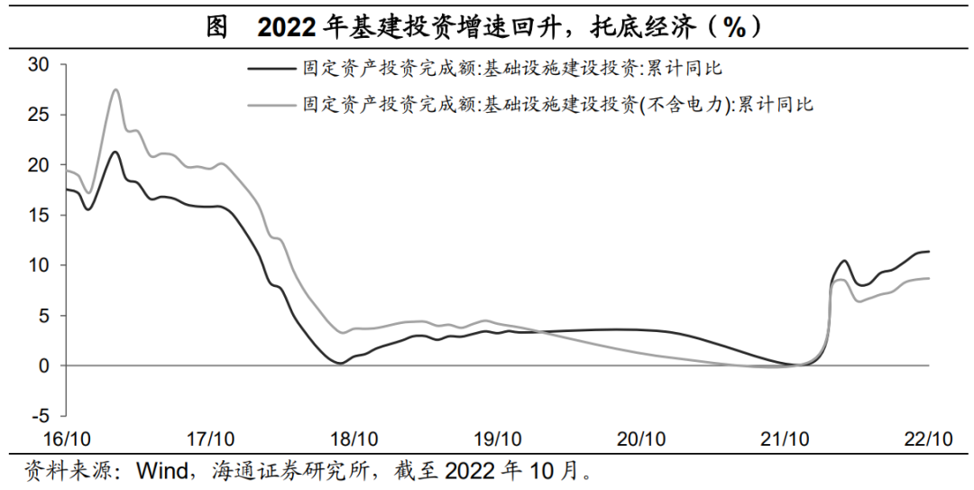预计基建增速或小幅走高。2018年以来,我国基建投资(不含电力)告别高增长,2018年基建投资增速为3.8%,2019年为3.8%;2020年新冠疫情冲击经济,基建投资也只有0.9%;2021年为0.4%;2022年前10个月增速回升至8.7%。考虑到2023年经济仍有稳增长压力,预计基建投资增速或继续小幅回升至10%附近,但整体上或将重点投资高质量的基建项目。
