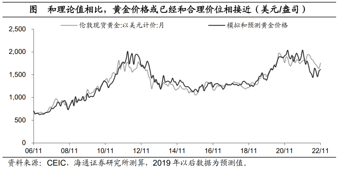 黄金价格或震荡上行。2022年年初以来,美债实际利率大幅上行,反映纸币的实际回报率在提升,但在上半年黄金价格并没有大幅下跌,之后黄金发生下跌。我们根据目前美债实际利率测算,黄金价格或已经和合理价位相接近。但接下来黄金价格的机会主要来自美元的大幅宽松,目前来看,这还需要耐心等待。在美国经济持续下行、通胀压力缓解后,如果美联储明显放松货币政策,黄金价格的明显上涨或才会到来。