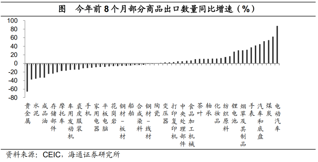 哪些出口还不错?从出口数量来看,目前电动汽车、太阳能电池、煤炭、纸浆、汽车、箱包、烟草、稀土等产品还维持高增长或正增长。