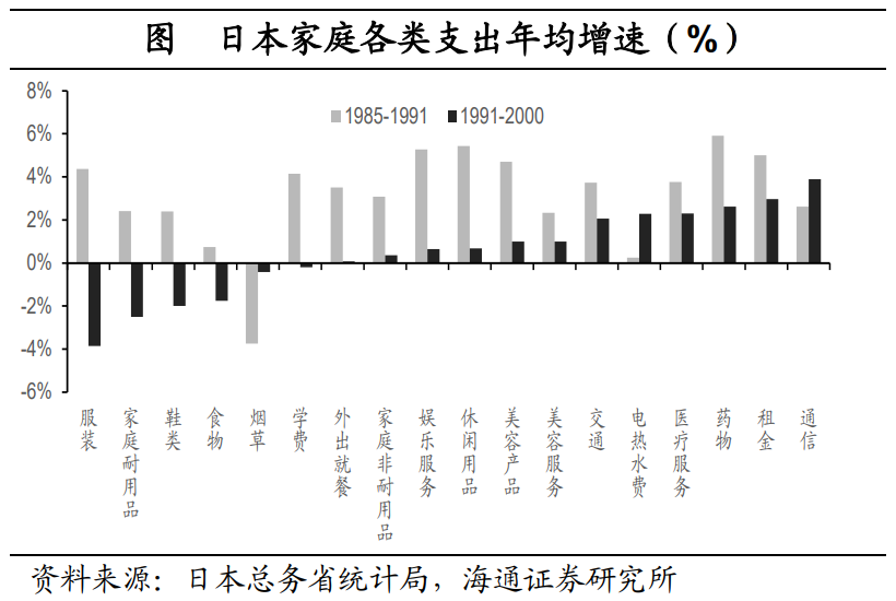 从对消费的影响来看,当年日本进入“低欲望”社会,消费结构转变,奢侈消费退潮。从消费结构来看,除通信消费外,大部分分项消费的增速均有降低,食品、衣着、家庭耐用品等商品消费均转为负增;娱乐相关的用品和服务支出虽仍保持正增长,但增速中枢也明显下降;1990年后手机开始高速普及,在日本的普及率从1991年的1.9%飙升至1999年的62.7%,通信消费支出增速反而出现明显上升。