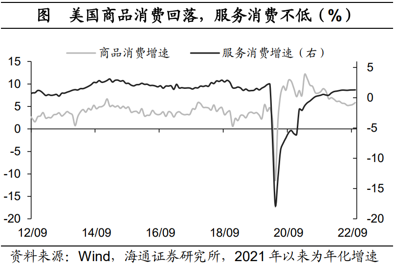 消费增速也并不算弱。截至2022年9月,美国实际消费年化同比增速仍有2.5%,其中商品消费有所回落,但服务消费仍然不低,并且年化增速还在改善。截至2022年9月份,服务消费年化增速仍有1.3%。考虑到居民最终消费支出占美国GDP的比重高达67%左右,在当前美国消费表现仍有韧性的情况下,短期可不必对美国经济过于担忧。