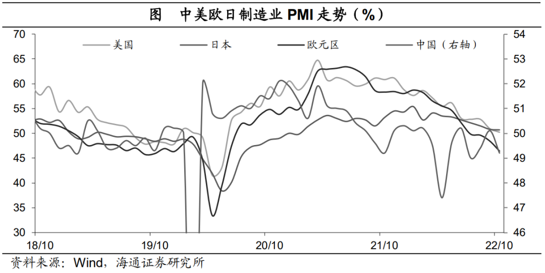 从需求结构来看,外需或继续降温。通胀压力导致货币收紧,高利率压制需求,海外主要经济体PMI指数均有明显回落,海外需求或延续降温趋势。