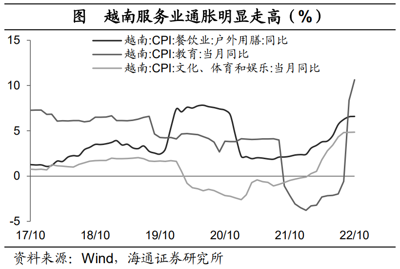 从去年10月后,越南CPI同比震荡走高,从2%以下大幅回升至今年10月的4.3%。其中餐饮通胀从2.2%回升至6.6%,教育通胀由负转正为10.6%,文化、体育、娱乐行业通胀也由负转正为4.9%。