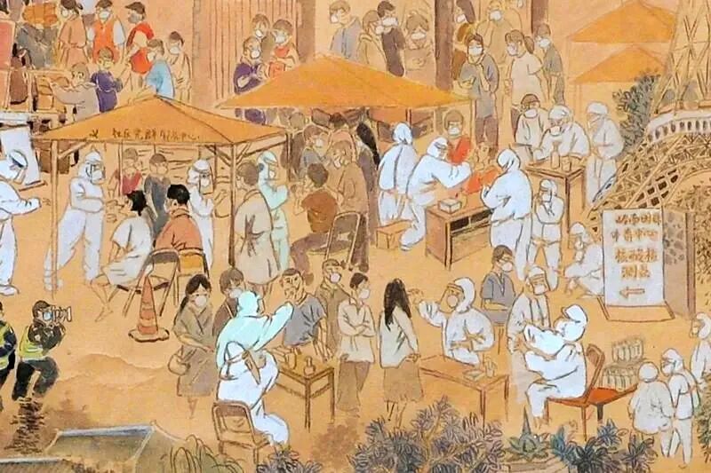 《核酸检测上河图》,是陈志杰根据自己的亲身经历创作的。形式上,借鉴了《清明上河图》的表现手法。整幅画卷,以大规模核酸检测为背景,共绘有大概345个人物,15个当地景点和标志性建筑物。