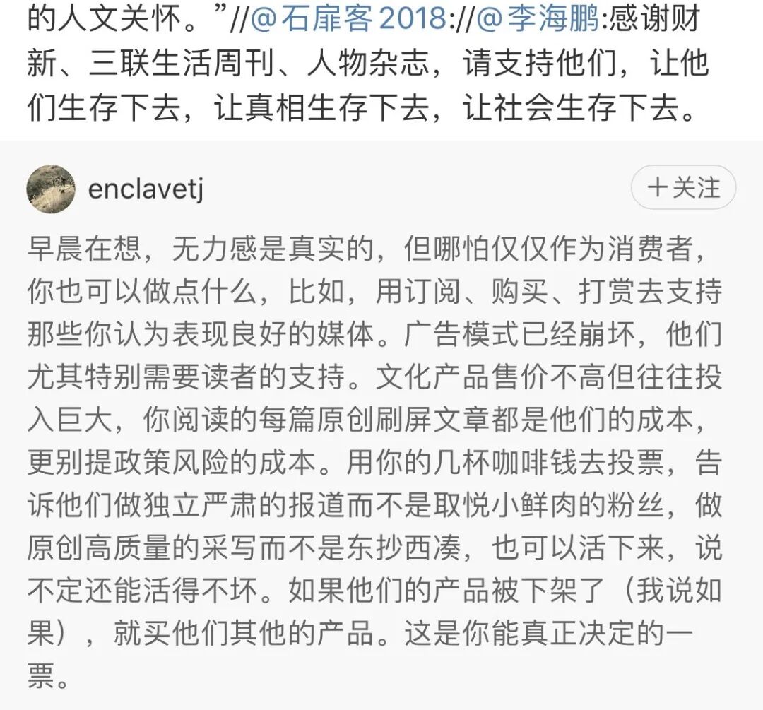 还呼吁大家,“用你的几杯咖啡钱去投票,告知他们做独立严肃的报道而不是取悦小鲜肉的粉丝,做原创高质量的采写而不是东拼西凑,也可以活下来……”