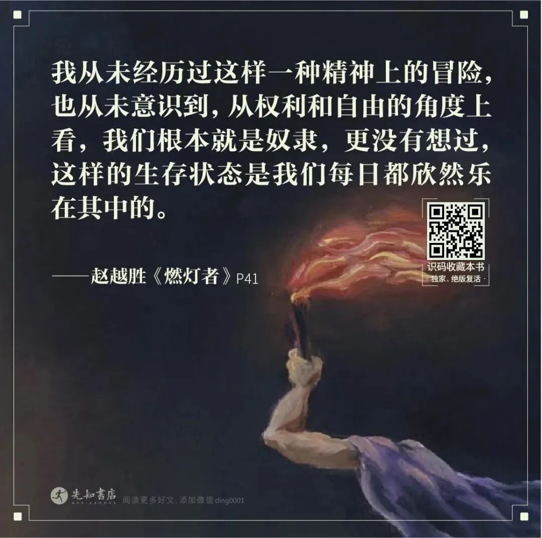 为此新少数派诚挚推荐:赵越胜先生著《燃灯者》(最新修订版、绝版、独家):1.□□□:本书因不可言说原因,曾“消失”几年时间。现少量复活,尽力保留了最初的内容。2.经典:本书被视为记述改革开放前后两代知识分子交往的经典之作,周国平作序,陈嘉映、徐友渔、白岩松、徐晓联名推荐。3:稀缺:网上已溢价到100多元,先知书店有幸与出版社达成合作,仅售42元,新会员即可19元购买。4.思想厚重:作者为燃灯者立传,为思想找寻薪火相传者,也为这个价值与情操全面失守的世界留下了一声沉重的叹息。5.文采极好:刚出版,就荣获第十届华语文学传媒大奖年度散文家奖。6.口碑:有书友说:“刚拿到本书只是惊叹价格便宜,但读完以后,价格只是一方面,更让人惊讶的是,这本是让人为之落泪。更有幸见证了那个年代“燃灯者”,将自己的光投射给众人,并点亮了一代又一代的人,这才是本书最大的价值”。本书刚复活两天就已经卖出1100本左右,识别下图二维码,即可一键收藏独家、绝版书,刚复活后,已经所剩无几。![]()