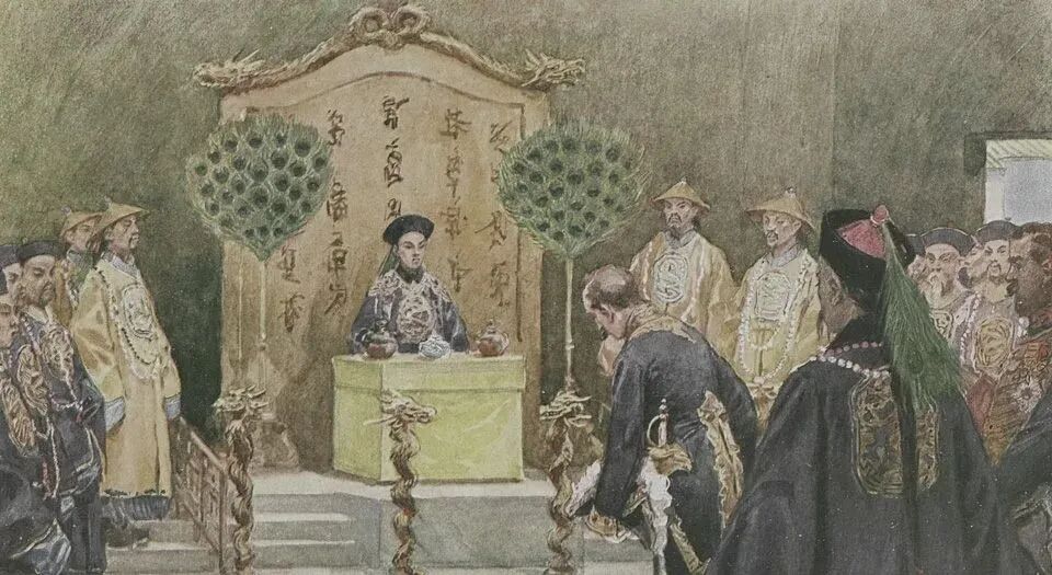 1873年6月29日,日、俄、美、英、法、荷等国使节在紫光阁顺序觐见清同治皇帝,未行跪礼,总共约半个小时。有必要一提的是,日本使臣只行了三揖之礼,其他使节则行五鞠躬之礼。虽只短短半小时,但这见皇上/天子不下跪的半小时却是划时代时刻,是“天朝”崩溃的重要标志。