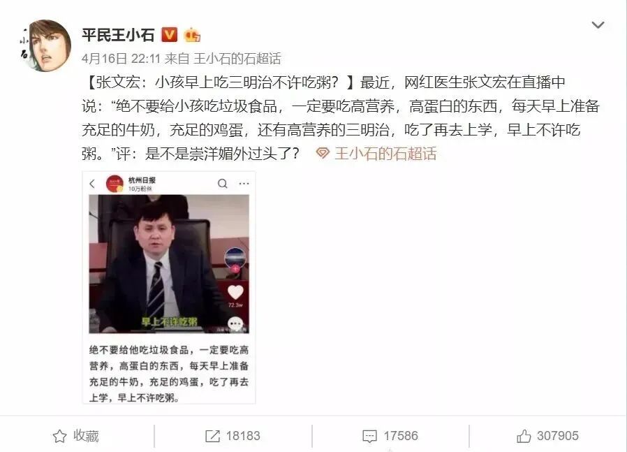疫情期间,张文宏说白粥缺营养,要多吃鸡蛋牛奶等有营养的早餐提高免疫力,却被扣上“崇洋媚外”的帽子。