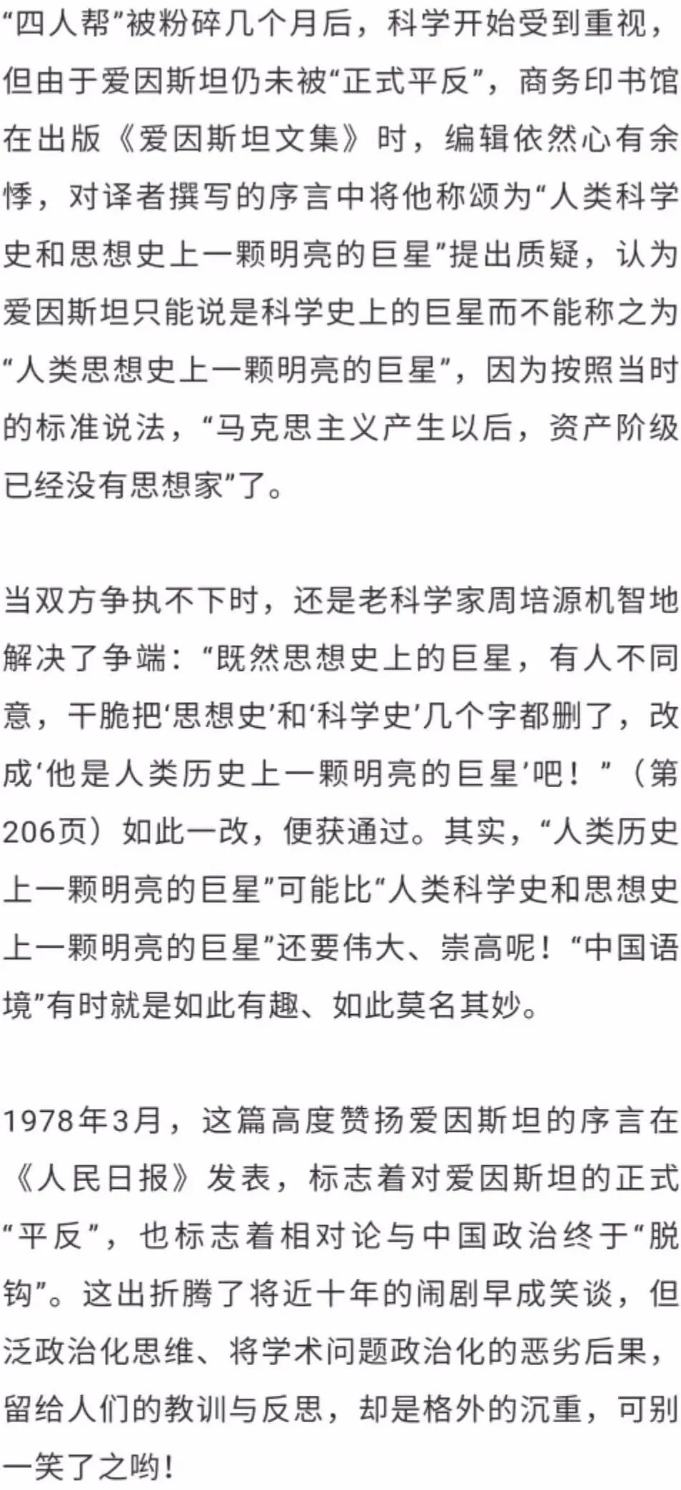 当时的上海理科大批判组还极尽造谣诬蔑和人身攻击的能事,他们在1970年发表的文章“爱因斯坦的相对论”中写道:“帝国主义需要相对论这样的‘科学’需要爱因斯坦这样的‘科学家’。”“他一生三易国籍,四换主子,有奶便是娘,见钱就是下跪。有一点却始终不渝,那就是自觉地充当资产阶级恶毒攻击马克思主义的‘科学喉舌’。”这样的文章,居然登上了全国最高级政治杂志。 在一本由上海理科大批判组写的《爱因斯坦》的初稿中,他们完全不顾事实、信口雌黄地写道:“爱因斯坦一生,作为资本主义社会里资产阶级知识分子的代表,有不满现实的一面,是为副;又有反对革命的一面,是为主。”“他高喊,科学家应该联合起来,对政治问题不应当采取沉默态度,应当跪在资产阶级面前,乞求自由、民主、平等。” 通过引用的这极小一部分的资料,就足以看出,在“四人帮”专制时期时,是如何严重地阻碍和破坏科学的进步。1930年,爱因斯坦就说过: 在我看来,强迫的专制制度很快会腐化堕落。因为暴力所招引来的总是一些品质低劣的人,而且我相信,天才的暴君总是由无赖来继承,这是一条千古不移的定律。 爱因斯坦发现的这条“千古不移的定律”,无论对于历史和现实都有重大的意义。 科学自身的特质,就离不开自由,就与专制是势不两立的,任何专制者都一定会迟早拿科学和科学家开刀。纳粹时期如此,麦卡锡时期如此,“文化大革命”时期也是如此。纳粹时期,专制者把科学分为“德国的”和“犹太人的”的两种;麦卡锡时期把科学家分为对美国“忠诚”与“不忠诚”两种;“文化大革命”时期则把科学和科学家分为“资产阶级”和“无产阶级”的两种,这统统是为了不可告人目的而颠倒是非、指鹿为马,是对科学的污蔑和诋毁。自然科学从来不属于任何特定的阶级,它属于全人类,自然科学中的学术权威也同样如此。 1971年11月,正当“批判”的恶浪一阵高似一阵之时,周恩来在接见意大利前总理、社会党领袖南尼时特意指出:“犹太民族出了一些杰出的人才。马克思是犹太人,爱因斯坦也是犹太人。”这句现在听来极其平凡的话,在当时对“批相班”幕后指使人可谓当头棒喝。还有许多正直的科学家如竺可桢副院长、周培源教授,对这种倒行逆施作了机智的斗争。例如1971年夏天,在北京召开的全国教育工作会议上,周培源就公开发表了反对批判爱因斯坦和相对论的意见。商务印书馆还利用机会,巧妙地将许良英、李宝恒等人翻译的《爱因斯坦文集》的第一卷和第二卷于1974年和1975年相继付排,并于1976年1月将第一卷印出,第二卷于1977年3月出版;第三卷则在1979年10月出版。 “文化大革命”于1976年结束后,中国终于迎来了科学的春天,人们终于有了封面为淡绿色的三卷本《爱因斯坦文集》。到1994年已经是第4次印刷了。1979年爱因斯坦诞辰100周年的时候,中国科学界举行了隆重的纪念会,还出版了《纪念爱因斯坦译文集》。国外最好的几本爱因斯坦传记的中译本,也先后在国内出版;至于国人自己编写的爱因斯坦传记就数不清有多少了。1999年,湖南科学技术出版社斥巨资启动了一个更大的工程,出版《爱因斯坦全集》。 爱因斯坦著作的陆续出版,是我们“最大限度地追踪爱因斯坦的思想、生活及科学活动,从中领略到科学和文化在现代社会中的深远影响”的最好机会。同时,这也是我们纪念爱因斯坦的最好方式。