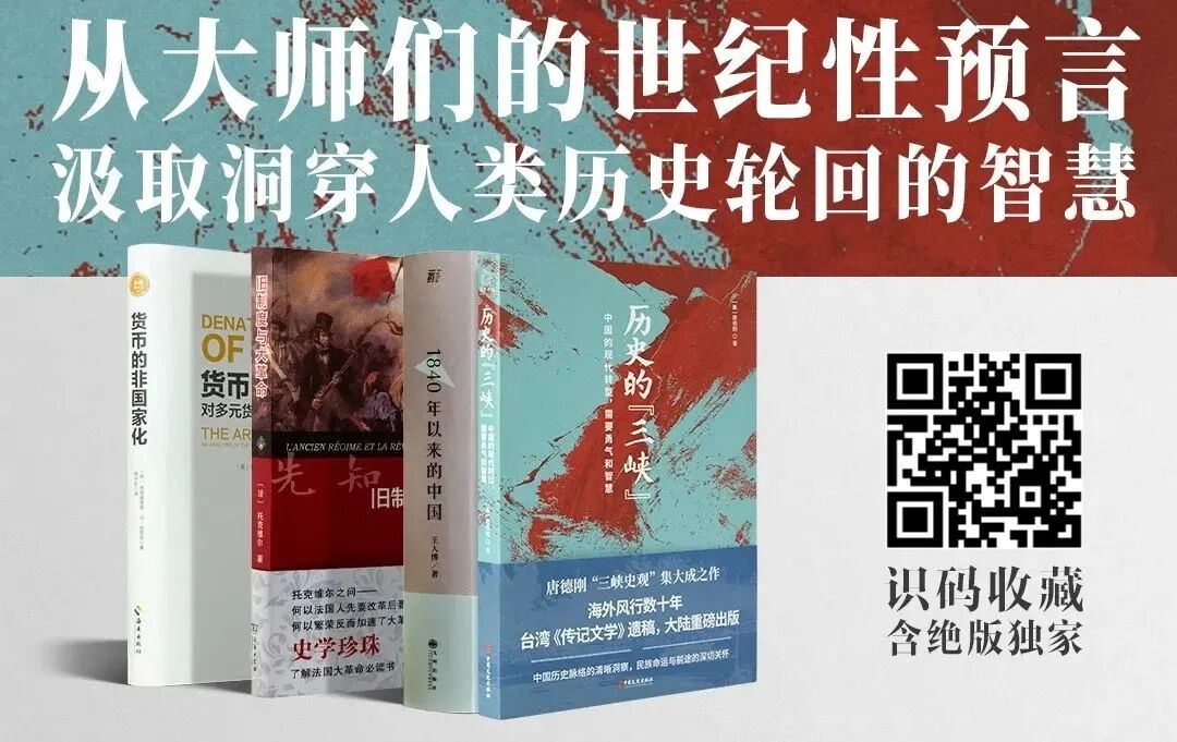 为此,先知书店诚挚推荐“先知的世纪预言”书单,包含托克维尔的《旧制度与大革命》、哈耶克的《货币非国家化》、唐德刚的《历史的三峡》的世纪预言,以及仍在接续唐德刚世纪预言的王人博老师的《1840年以来的中国》。在这个大多数著作都陷入鸵鸟式思考的时代,他们的世纪性预言却超越了时间的局限,警醒我们要对历史保持谦卑、对权力与理想保持警惕,否则灾难将一再重演。识别下图二维码,即可一键收藏。