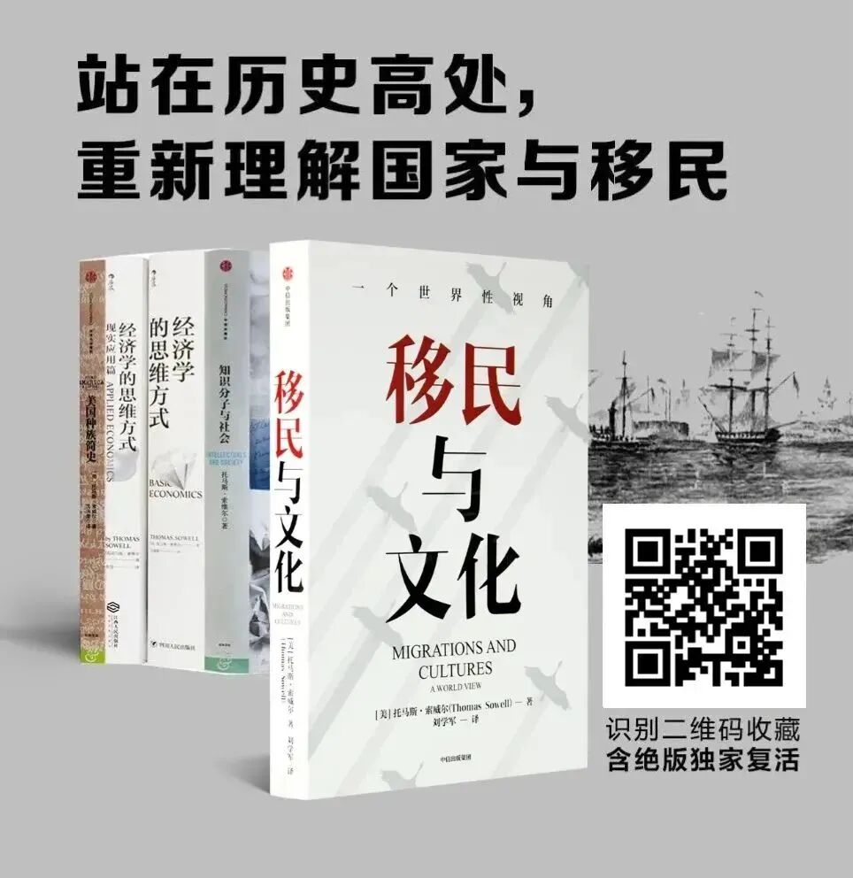为此,新少数派&先知书店诚荐托马斯·索维尔的《移民与文化》,它从世界性历史角度出发,展现了人类国家构成方式的历史变迁、冲突与融合。它用优美的文笔展示了这一进程。这本书,可以说是思考这些重大问题的起点。而且本文正是选自托马斯·索维尔的《移民与文化》,识别下图二维码,即可一件收藏。(还可在规格中一键选购索维尔作品集,含绝版书)。