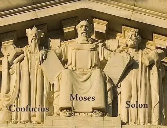 出现这个问题的根源在于,国人对”法“这个词的理解,出现了偏差。按照国内教科书的定义:法是国家的产物。是指统治者(统治集团,也就是政党,包括国王、君主),为了实现统治并管理国家的目的,经过一定立法程序,所颁布的一切规范的总称。而这个定义,事实上是不准确的。这是中国古代的“法”字,这个字由两部分组成。一边是水,代表着象水一样平,象征着公正。而另一边的“廌”字,则代表着解廌(獬豸)。解廌(獬豸)是古代传说中的一种神兽,它能辨别曲直。所以,法字,实际代表的公正的分辨是非曲直。这个字的含义,与我们说的法律,是有很大区别的。从西方现代法学理论上分类,法,分为成文法与自然法(也成为习惯法,又叫先王之法),而我们国家现在法的定义,实际是指的成文法。而把自然法,习惯法有意无意的忽略掉了。说到这里,我们就可以理解为什么摩西会成为伟大的立法者。因为摩西制定了摩西十诫。摩西十诫虽然不是法律,但是成为基督世界的行为规范,是地道的先王之法,也完全符合习惯法,自然法。而孔子呢,孔子的贡献在在于“道”。我们一听到“道”,就会误以为是道德。实际上,孔子的道,远远超出了道德的范围,涉及到社会的方方面面。就是儒家对君王的道的定义:“子之在上无道,据傲荒怠,贪戾虐众,恣睢自用也,辟远圣制,謷丑先王,排訾旧典,上不顺天,下不惠民,徵敛无期,求索无厌,罪杀不辜,庆赏不当。”这哪里是道德?而是一部完完整整的行为规范,其完整度,细腻度,是可以比拟的。事实上,孔子的道,和摩西十诫,奠定了东西方2000年来人们行为规范的基础,是名副其实的先王之法,习惯法,自然法。这也是为什么孔子与摩西能成为联邦法院门楣上的伟大立法者。然而,我在网上也曾经看到,有些朋友质疑:为什么是孔子,而不是商鞅?商鞅作为法家,是中国历史上名副其实的立法者。其原因,并非因为商鞅比孔子晚一些,而是因为商鞅的法律体系。“法”字的含义,实际代表的公正的分辨是非曲直。而西方法律的形象也同样永远离不开一架天平。所以,法,无论是成文法,还是自然法,习惯法,都必须建立在公正的基础上,至少说,是那个时代的公正基础上。所以,商鞅没有入选,而索伦之前的众多立法者,也同样没有入选。索伦在历史上做的最终要的贡献,就是梭伦改革。通过对前世留下的法律进行全面的改革,废除大量残暴的法律,是法律重新建立在相对公正的基础上,从而奠定了自己“伟大的立法者”的地位(但不是最早的)。而商鞅呢?我们只要从他的作品《商君书》中的一段话,就可以了解商鞅立法的实质。“民弱国强,国强民弱,故有道之国务在弱民”——《商君书》之《弱民篇》。单凭这篇作品,就足以将商鞅踢出“伟大的立法者”的行列了。说到这里,大家可以思考一下,为什么我们几千年来,把法的定义,固化在成文法上面,而完全忽视了习惯法,自然法的内涵呢?这里面的根本原因(和道德无关,前面说过,道,不是道德)在于成文法与习惯法的关系。任何一部成文法,都应该建立在习惯法的基础上,成文法,是对习惯法的一种固化的,强制性的表述,当成文法脱离自然法,违背自然法时,结局只有两个:2、爆发革命推翻统治者,然后重新制定符合习惯法的新成文法。如在东周时期,奴隶殉葬还是存在的,但是随着时间的发展,人们对殉葬制度越来越不能接受,社会的习惯法发生了变化,体现在成文法上,就是把殉葬视为犯罪。这样的变化,在人类历史上发生的太多了,像废除奴隶制,反种族歧视等等,都是这种变化的体现,而黄俄的法律则完全背离了这一规律,背离了习惯法,如没收地主,资本家财产,使官府的抢劫合法化。都是与自然法,习惯法,极其违背的。因此,古代王朝就需要尽最大努力,弱化自然法的地位。让大家以为,只有他们制定的法律才是至高无上的,百姓无权过问。同时,对传统的文化,道德,行为规范,进行大规模的歪曲,抹黑,批判,说到底,就是为了愚民,以此,来巩固自己的统治地位。我们看看梭伦改革的内容,就知道他为什么是伟大的立法者了:2.废除德拉古制定的残酷法律,只保留关于谋杀的部分;3.按财产的拥有量将公民分为4个等级,其政治权力按照财产来决定;4.恢复公民大会作为国家最高权力机关,各等级公民均可参加;5.在贵族会议之外设立四百人会议管理国家,前三等级公民均可入选;要考虑时代,梭伦是和孔子同一时代的人,在那个时代,这个制度无疑是先进而公正的。所以,自然法是会随着时代变化的。有些古老的法律,现在看是落后而野蛮,但在这个制度建立之前却存在着更野蛮的风俗,那些古老的法律在当时是人道而先进的。孔子为什么是伟大的立法者呢?因为他为中国传统社会确立了元规则,作为统治者,必须合道统,这个道统就是仁义道德。作为民众,你要知礼,所谓知礼就是要守秩序,要忠孝仁爱,要知道分寸,也就是儒家说的中庸之道。孔子是中国前两千年的立法者,中国道统的开创者。“刑不上大夫:故其在大谴大何之域者,闻谴何,则白冠牦缨,盘水加剑,苟请自裁”——意思就是,士大夫犯了罪,不要等到有司拿办,罪过轻,就自负请罪,罪过重,就穿上白衣,拿上宝剑,到河边自裁吧。如日本铁路事故,社长自杀;韩国沉船,校长自杀,都属于典型的刑不上大夫。“礼不下庶人者,以庶人遽其事而不能充礼,故不责之以备礼也”——意思就是平民百姓,整天要