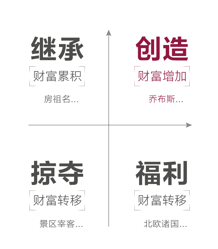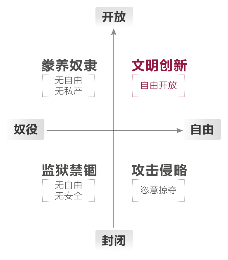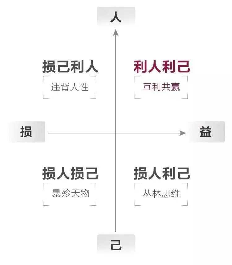 发达国家的职业风气,从来都是“学而优则商”;落后国家的职业风气,从来都是仇恨商人、鄙视商业。——题记商业是什么?中国传统文化中主流观点认为:“无商不奸”,商业代表着剥削、商人等同于趋利的小人。然而孟德斯鸠却说:“有商业的地方就有民主、自由和法治。”哈耶克也认为,商业才是最大的公益。那么,这两种思维究竟孰对孰错?先知书店团队在阅读了多部经典之后,将一些对我们生活至关重要的经济常识提炼出来,并图表化,以更直观、简练的方式厘清那些长期被国人误解的经济常识。希望与各位书友共同探讨,并不断完善。人类社会的任何组织形态(比如联邦、国家、民族、社团),都可以用两个指数来标明:一个是自由度,一个是交流度。如图所示,越往右表示自由度越高,人们受到的强制越少;越往上表示交流越频繁,人与人之间的沟通越充分。❶ 第一象限的状态是,人既有自由,又可以充分地与他人沟通。这种境况就是令亚当·斯密惊叹的“看不见的手”:每个人都可以合法地创造和占有财富,由此平等的市场交换才成为可能,并且可以发挥自己的专长。给他人带来幸福的同时,也不断地积累自己的财富;在不受阻碍的商业活动中,当专门从事商业的“商人”出现以后,任何职业的人可以更加专注地从事自己擅长的专业,社会分工更加高效。(参阅亚当·斯密《国富论》)❷ 第二象限的状态是,人没有自由,但人与人之间可以充分交流。比如美国建国初期的黑奴,他们可以替主人管理家务、出门采购,但他们创造的财富不属于自己,因为法律规定他们就是白人的财产,一旦想要脱离主人的控制,他们就会被捕杀或是流落荒野。❸ 第三象限的状态是,人既没有自由,也不能相互沟通交流。这是监狱里的囚犯。例如纳粹集中营里的犹太人,不仅私人财产被悉数剥夺,就连生命安全都得不到任何保障,处于被生杀予夺的状态。❹ 第四象限的状态是,人有一定的自由,但是等级之间基本处于固化状态。如古代中国北方的游牧民族,部落内部有着森严的等级制度,等级身份世代传承,上一等级对下一等级拥有绝对权力。对外,与中原农耕民族几乎没有沟通。开放、自由的社会,是人类减少暴力、获得幸福生活的契机和根本。基于平等、自愿的交换,才能产生稳固的契约关系,从而产生协作共赢的社会关系。互通有无、各尽其能,是一种高效的协作方式,绝不是剥削压榨。商人的初始动机只是牟利,但却成了促进沟通、弥补短缺的使者,社会契约的践行者。人类社会中的个人,获取财富的途径主要有四种:继承、掠夺、慈善、创造。比如,某医药公司发明了一种新药,能治愈一种顽疾。这家医药公司将这种新药拿到市场上出售,解除了很多人的病痛,甚至增加了某一地区的平均寿命。那么毫无疑问,这家医药公司为他人带来了幸福,同时自己也获得了应有的回报。当合法继承权受到有效的保护,人们才更有创造财富的动力。但是在继承的过程中,并没有新的财富产生。比如爷爷的房子传给爸爸,爸爸传给你,你再传给儿子……广义的掠夺不仅仅是偷抢拐骗。凡是以不公平的手段侵害他人正当利益的,都是掠夺,比如苛捐杂税、滥发钱币……路边的乞丐、福利院的孤儿、接受救济的穷人……这些人获得他人的捐助,本质是一种慈善或公益。显而易见,只有在第一象限下,社会财富总量增加了,在可预期的未来,人们的协作能力会进一步提高。在第二、三、四象限下的行为,无论其出于自愿,还是被迫,其实质都是一样的:财富总量并没有增加,只是从一部分人转移到另一部分人。无论是继承、慈善,还是征税、印钞,都只是对财富进行转移,财富的总量并没有增加。无论是制造商还是中间商,他们都必须给他人带来更多的幸福才能盈利。商人售卖的商品或服务必须不断适应市场需求,新的社会财富才得以源源不断地产生。商人的初衷或许只是赚钱,但由于公平市场的存在,他们的自利行为促成了利他的结果。价格(人的主观需求)决定价值,市场是价格形成的前提,只有自由、平等的个体之间,才能发育出市场经济。人是观念的动物,因此个人在群体中必须思考自己与他人的利益关系。如上图所示:这种人想获得更多利益,但他懂得,想要一直获利,必须与他人密切合作,帮助他人解决的问题。正如图一所说,自由开放的社会,使私有财产的占有和交换成为可能,因此人和人之间不必像动物一样弱肉强食,而是可以通过平等自愿的交换,达成互惠互利的高度协作。反之,封闭、不自由的社会则必然带来匮乏和暴力。这类人热心公益、不要报酬。一次两次不难,难的是一直这样。而且,当受助者养成了凡事都要被帮助的习惯,并认为这是“天经地义、理所当然”时,那这种帮助就会变成道德绑架。可见,“毫不利己、专门利人”的要求不仅不现实,而且不可能持续。这种人自己不想获利,也不想别人获利。比如,有人看别人家鱼塘养鱼挣钱多,晚上偷偷下毒毒死鱼苗,对他人的损失幸灾乐祸,但结果是,自己不仅不能获利,还可能面临赔偿,甚至刑罚。这种人信奉“人不为己、天诛地灭”,认为人类社会就是弱肉强食,典型代表比如“毒奶粉”的供应商、贪污扶贫款的腐败分子。持续、高效的相互协作是文明人类特有的智慧,商业交换是一种平等自愿、互惠互利的文明规则。在创造财富中起决定性作用的,不是“无差别