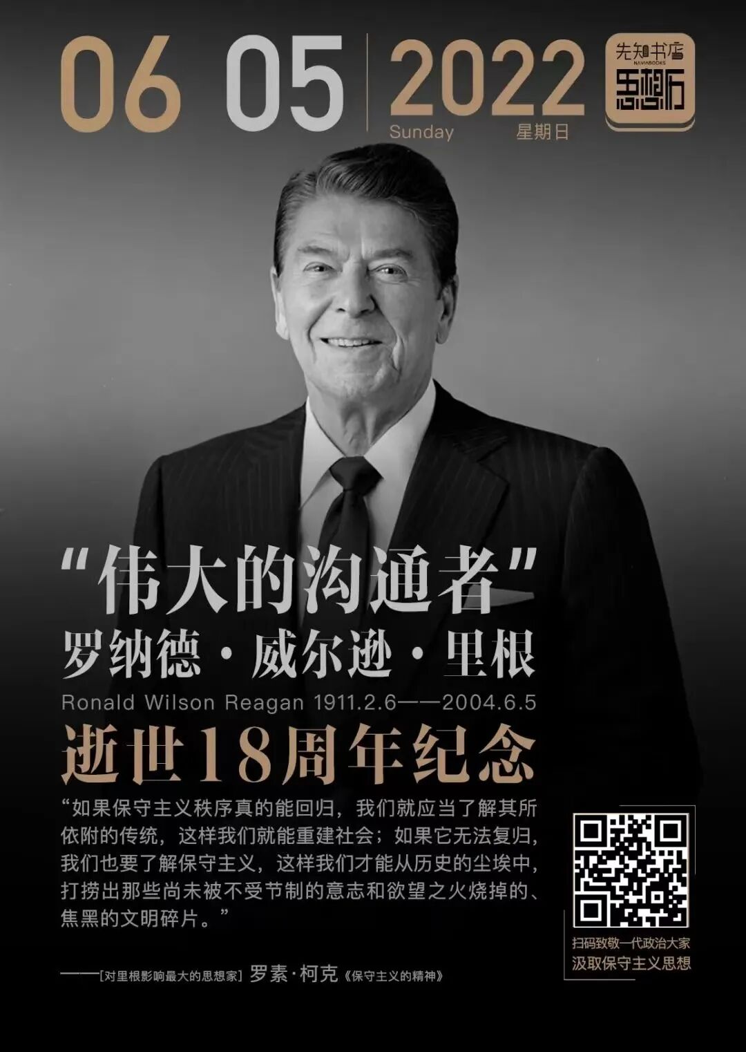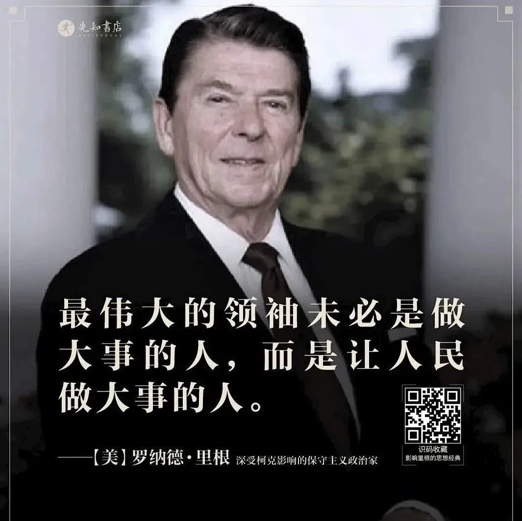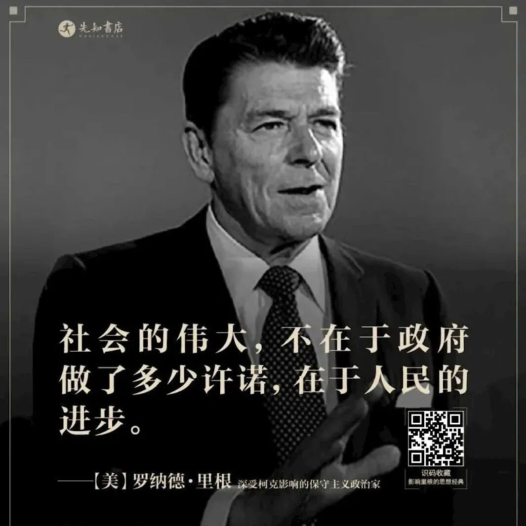 因为,正是借助他们的思想体系,才构建出真正的美国价值。对通往奴役之路的警觉,对维护社会安宁的自由秩序的捍卫,这些思想无不出自历史上的这些保守主义思想家们,他们是乌托邦最坚定的反对派,是自由价值最坚定的守卫者。为此,先知书店诚挚推荐“里根保守主义系列”,包括记录里根八年总统生涯执政方略的《里根:想象的胜利》、柯克的两部作品、哈耶克的传记和哈耶克的作品集。读里根读过的书,汲取保守主义的思想精华。印象中,美国的制度,是华盛顿、杰弗逊、富兰克林等国父们,在费城根据某个新思想,“设计”出来的新东西;但实际上,这些看起来非常新的制度,无一不是建立在早已有之的文明根基之上。里根所推崇的,正是这些最根本的东西。源于思想的观念与制度,构成了一个社会最基本的行动逻辑。两百多年来,保守主义思想塑造了强大的英美世界;变局时代的今天,保守主义思想再次成为那道刺破夜空的亮光。识别下图二维码,即可一键收藏。来源 | 部分图片和段落选编自网络。如有侵权,请联系我们删除。