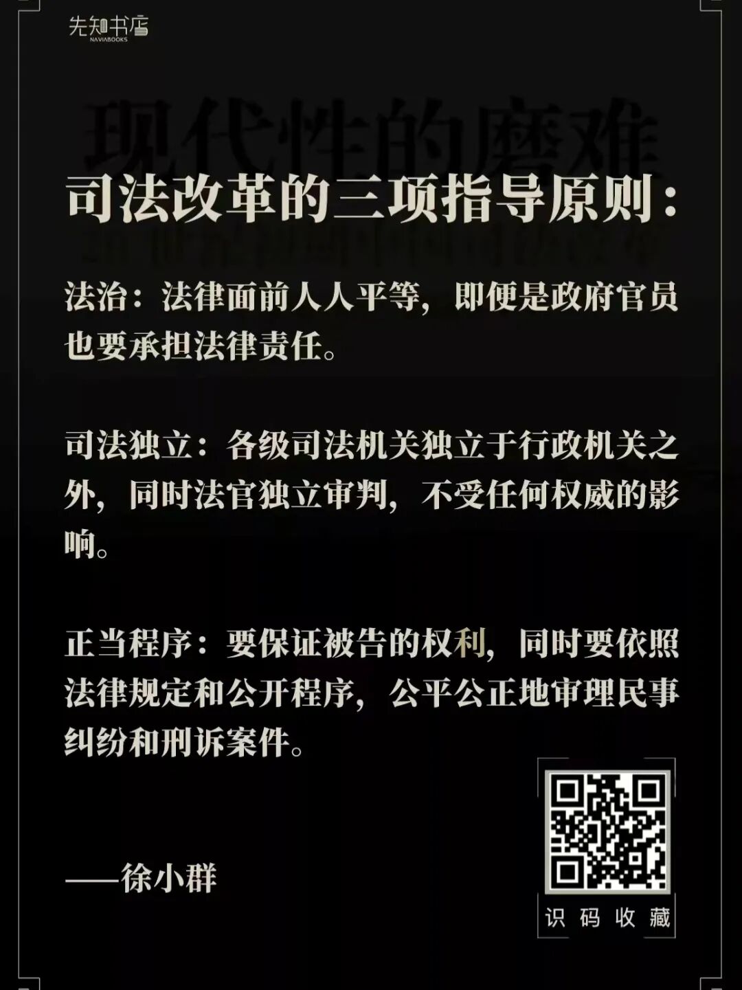 哈耶克曾对法律的目的做过精准诠释:法律不是要废除和限制自由,而是保护和扩大自由。然而,在很多人看来,近期“红码”“黄码”等海啸级事件,毫无疑问都违背了法律的初衷。比如,绝大多数人都将“红码事件”的处理方式当成一件“官民不同罪”的执法后遗症;而那场黄码引发的警民冲突之所以更恶劣,恰恰是它仿佛揭示了“少数公权可以根据需要定义法律”的荒诞现实。当然,有些人一直苦口婆心地强调,这些热点事件的背后不仅是法治问题,还是有特色的社会问题、政治问题。——但其实,少有人谈到的,却是它们“从头到尾”,更该被视为“司法问题”。不过,由于大多数人对司法存在“种种误解”,这才过分低估了司法的力量和边界。其实,司法的重要性正如托克维尔所言:——几乎所有政治问题,或迟或早,终将转化为司法问题。一般人理解的司法,往往是“非常专业的立法与执法”。而美国哥伦比亚大学中国现代史博士徐小群教授,在研究近代中国司法改革的《现代性的磨难》一书指出,司法是衡量文明社会的标尺。在这个意义上,司法首先是一个文明社会的“地基”。换句话说,司法第一个层次是确立一套现代司法体系,对国人而言,尤其涉及“身份社会到契约社会的转变”。因为很多引起争议的事件背后,其实都不是“人人平等”的现代法治,而是“刑不上大夫,礼不下庶人”的传统法理。只有将“建设现代司法体系”当成目标,真正意义上的“法治社会”才算入门。然而,这期间远非一蹴而就,而要经历无数挫折与阻碍。与之对应,《现代性的磨难》一书正是通过大量篇幅横跨晚清、北洋、中华民国三个时代,书写了长达37年间司法改革的种种磨难。简单说,司法改革的核心磨难是“权力如何分配、运行的问题”。以众多热点事件为例,常规的解决方式往往分两步。先是政府出面“雷霆行动,从严从速”;后是具体部门“适度调整,简单处分”。然而,从真正的司法角度,我们需要的恰恰不是政府主导的专项行动,而是让权力各司其职的常态治安;不是“官官相护的抱团传统”,而是“权力相互制衡”的司法机制。即使明确了权力的分属、协调、制约机制,司法改革依然处于“进行时”。因为司法改革的最高层次往往不是司法的成功,而是“宪制的成功”。这种宪制绝非徒有其表的形似,也不是“自上而下”的强制性口号。事实上,清末时,清政府便已预备颁布宪法,然而,由于没有立法、司法、执法层面的具体分权动作,这种现代化的尝试最终以失败告终。清末的宪制转型运动,最终促使清政府设立了徒有其表的“皇族内阁”在书中,我们还可以了解到,要完成“宪制”改革,至少还需要当政者的决心,匹配的民情、及相应国际环境3大条件,只有克服这重重阻碍,中国才有可能跨越现代性的磨难,从根源上杜绝某些热点事件的反复发生。最近,接二连三的热点一次又一次刷新着人们的底线。然而,我们不应被“愤怒、绝望”等负面情绪裹挟,因为热点之所以出现,恰恰是履行了司法改革的部分功能——“外围监督”。只是,社会问题不能总靠偶发舆情和热搜去拯救,而必须建立一套完善的运行机制。而当下中国,建立这套机制当然离不开曾经早已实践过、亦可汲取经验的“司法改革历程”。为此,诚荐徐小群这本《现代性的磨难:20世纪初期的中国司法改革》。除了上文论述的“司法的3个层次”,本书还有其他4个推荐理由:◎本书是中国司法领域开创之作、也是弥补空缺之作,本书问世前,市场上几乎没有一本专门研究1901-1937年这段时间中国司法改革历程的书,司法类著作也屈指可数。然而,司法的重要性不可不谈,因为但凡人类活动,必然伴随冲突。而司法解决的,正是包含人类永恒课题的人的冲突。◎本书主题虽是20世纪初的司法改革,但却不只是“历史学”,更具有“未来学”的价值——因为重要的问题,不可能被一直搁置下去。事实上,现实中很多“恶劣法治事件”,本质上都是司法改革的问题、现代性的问题。◎本书作者徐小群,其经历、教育背景和研究方向,是少有的可以驾驭该话题的学者。而杨明、冯申两位专业译者亦提供一个符合汉语表达习惯、关键词翻译选择精准、行文流畅的绝佳译本。◎最后,现代性、司法等视角的书籍,都有一个“通病”:理论、思辨、概念太多。然而,本书却不但做到了重史实、重实践“以史统论”,亦充分诠释了张思之老先生“为好人辩护是良知,为人辩护是天职”的司法精神。因此,不仅适合所有关心中国社会转型的读者,也是所有法律工作者必不可少的案头书。总之,无论是推进中国司法改革、理解现代性之于人类的普遍意义,还是反思为何“现代化”在中国落地如此艰难,本书无疑都值得推荐。目前,该版本全网仅剩最后不足300本,分享给懂本书价值的朋友,扫描下图二维码,即可一键收藏。