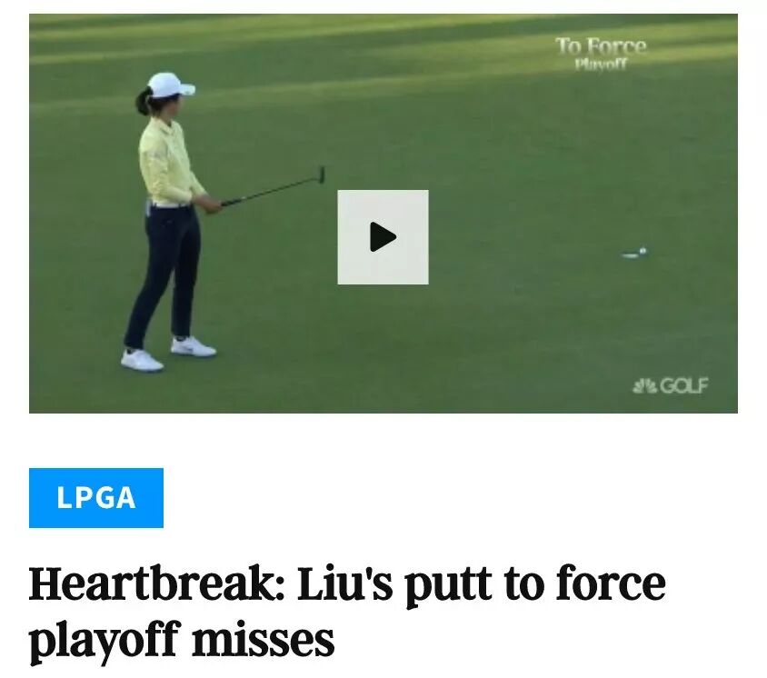 15英尺的保帕推,当北京姑娘的小球缓缓擦洞而过的一刻,现场数百名美国观众同时爆发出叹息之声。“心碎一刻!(Heartbreaking)”——美国高尔夫频道在首页上如此评论刘钰错失首冠的这一推。练习场上备战加洞的高真荣得知消息,更是深感庆幸长吁一口气:“我终于不用再练了。”