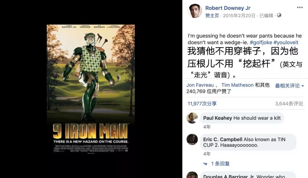 但不妨碍这位怪咖影星,用高尔夫的语言——《9号铁侠》来开玩笑,宣传《钢铁侠》的新片。