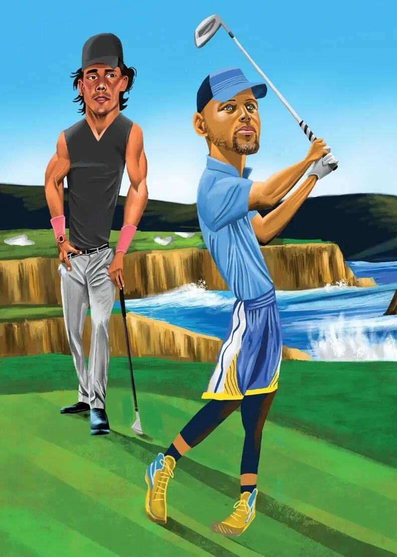 插画师笔下打高尔夫的纳达尔和库里