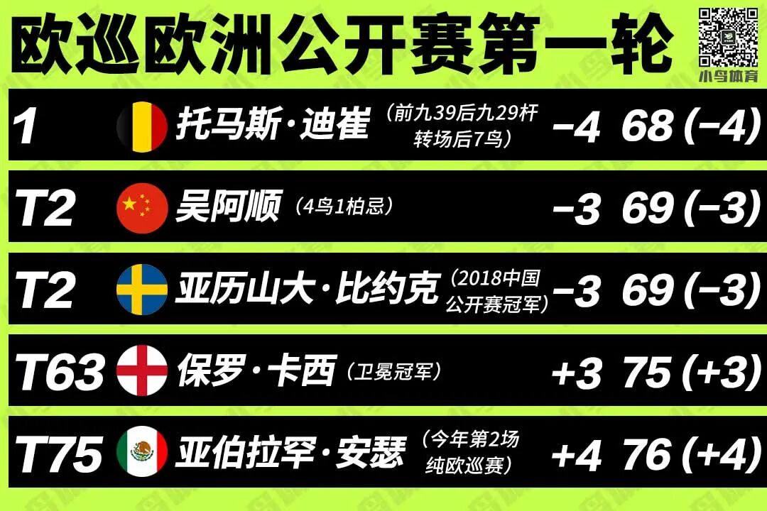 或许也由于升级当爹的原因,吴阿顺最近习惯了早睡早起——本周六在德国汉堡打响的欧洲公开赛 (Porsche European Open) ,他在清晨7:30,全场第一组第一个开球,结果打出完美的一轮开局——4鸟1柏忌,69杆 (-3) ,首轮结束后与其他3名球手并列第2位,仅落后领先者托马斯·迪崔1杆。