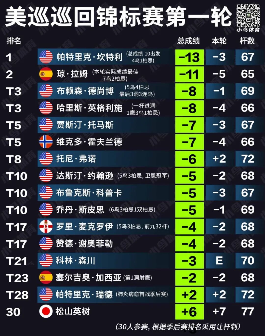 也就是说,坎特利在第一天开球之前,成绩就已经比4号种子拉姆少了4杆。这也可以解释本文开头的怪异一幕——今天凌晨坎特利的67杆,明明比拉姆全场最佳的65杆多用两杆,却依然可以以两杆优势力压西班牙人,高居榜首。