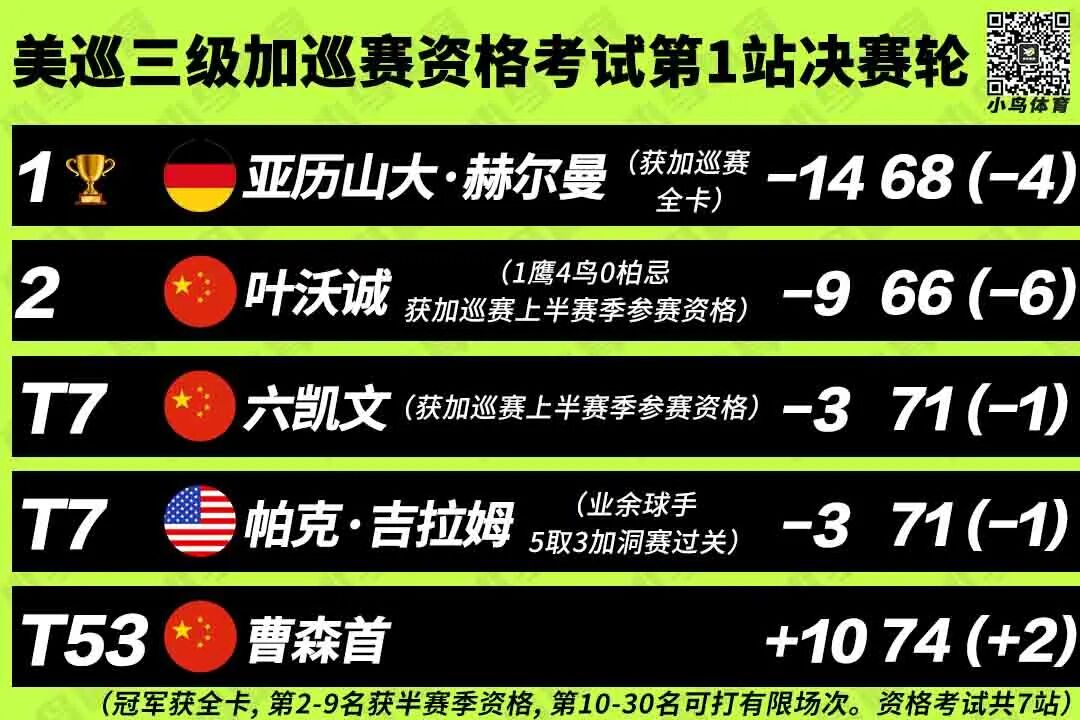 直到本周,加巡赛资格学校考试才在时隔两年后重新开启,将从2-4月在美国和加拿大进行7站资格赛,每站的冠军将直接获得加巡赛2022赛季全卡,第2-9名将获得半卡资格,第10-30名将获得有限比赛资格。3位中国球员——叶沃诚、六凯文、湖南小将曹森首就报名参加了美国东部的首站资格赛角逐。