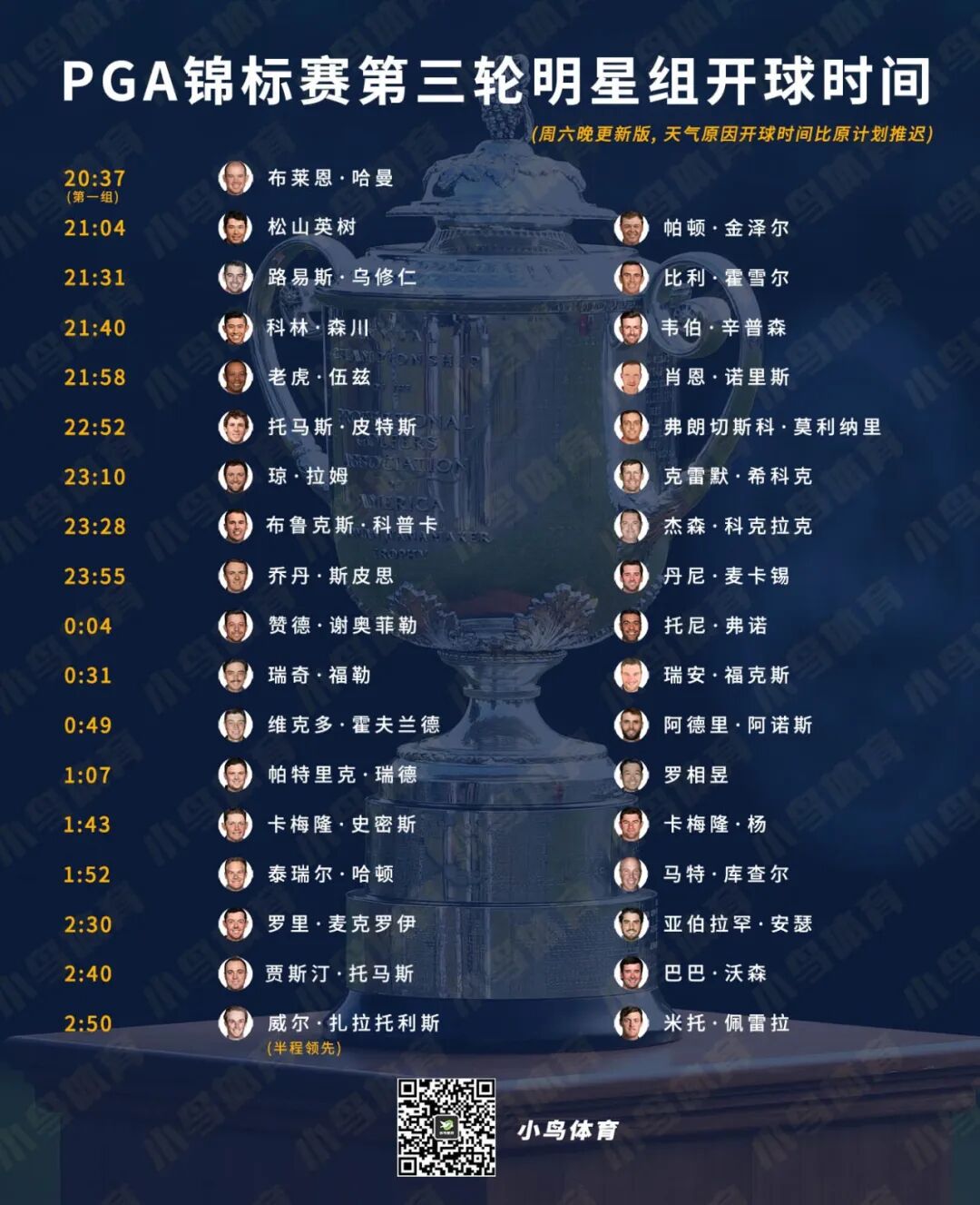 “我很清楚晋级线就是+4,要做的就是低于那个成绩。”老虎赛后说,“至于怎样实现,我的目标是要打出巴巴今天的杆数。”他指的是巴巴·沃森稍早时候以63杆完赛——PGA锦标赛的单轮历史最低杆!