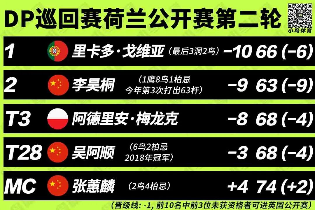 看上去,打出全场最低杆、飙升了70位的李昊桐,将以头名之姿进入到周末决赛轮争夺。不过下午出发的葡萄牙人里卡多·戈维亚 (Ricardo Gouveia) 依靠最后3洞抓下2鸟,在傍晚时分以1杆优势反超了前中国一哥。周六移动日,戈维亚将与李昊桐组成领先组,于北京时间19:50出发!两人中,曾是2014年欧巡挑战赛奖金王的戈维亚还从未染指过欧巡赛胜利,而李昊桐,则将在周末冲击个人的第3座DP世界巡回赛冠军。