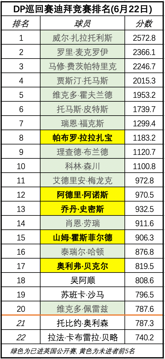 在吴阿顺之前,西班牙双雄帕布罗·拉拉扎宝 (第8位) 和阿德里·阿诺斯 (12) 、两位英格兰人乔丹·史密斯 (13) 和山姆·霍斯菲尔德 (15) ,以及南非人奥利弗·贝克尔 (Oliver Bekker/第17位) ,是目前英国公开赛“2022迪拜竞赛通道”入围线内的5位球员。