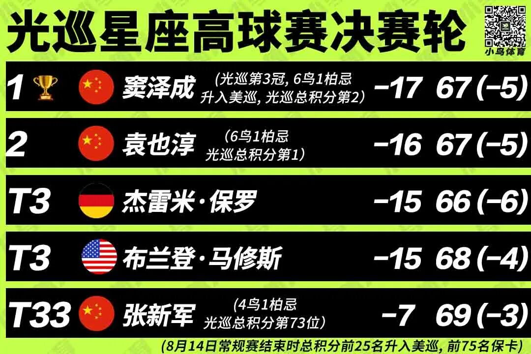 这的确是属于中国球员的一周:除了窦泽成和袁也淳,张新军也依靠本场比赛的并列第33名,重回赛季积分榜前75名行列,倘若他能将这个排位维持到5周后常规赛收官时,便将跻身光辉国际巡回赛的3场总决赛 (季后赛) ,从而争取另外25个美巡赛的升级名额!