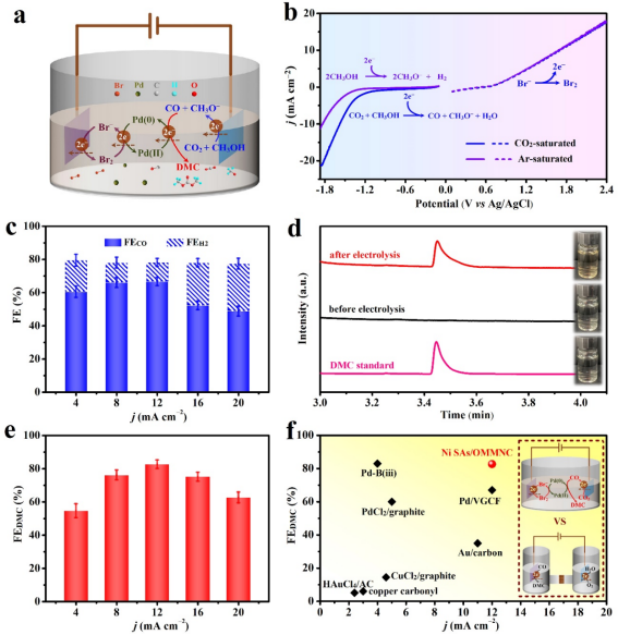 得益于在原子、纳米和微米多层次上对该Ni单原子催化剂进行结构调控,实现了CO2-to-CO高效转化。进一步,通过耦合阴极CO2RR与阳极卤素离子氧化反应形成的关键中间体成功了实现CO2到DMC的收敛成对电合成,DMC产物的法拉第效率高达80%。