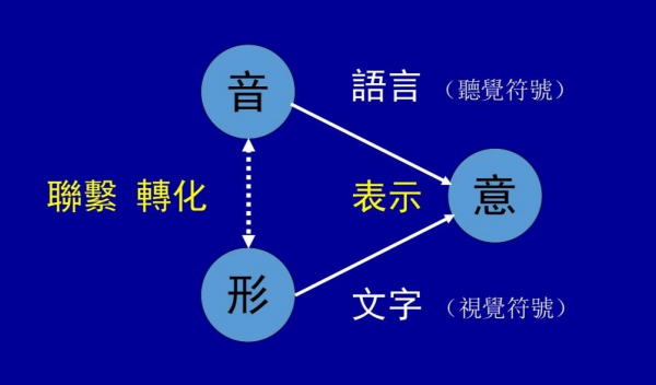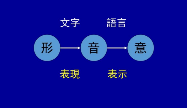 人看到字形可以讀出音來,是因爲這個人學過文字。字形和語音有對應關係,通過文字教學,表示意義的“語音”和表示意義的“字形”在人腦中建立了聯繫,於是學過文字的人看到“字形”可以讀出“語音”,也可以聽到“語音”寫出“字形”,這是語言和文字通過人腦進行相互轉化的現象。也就是說,文字只有“字形”,沒有“語音”。見下圖: