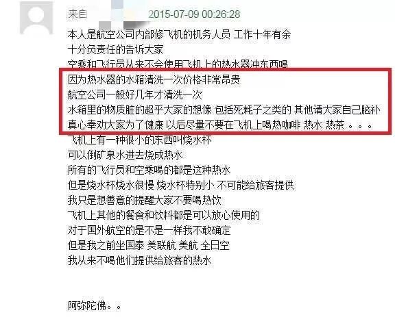 曾有网友在网上爆料,奉劝大家别喝飞机上的非瓶装水……