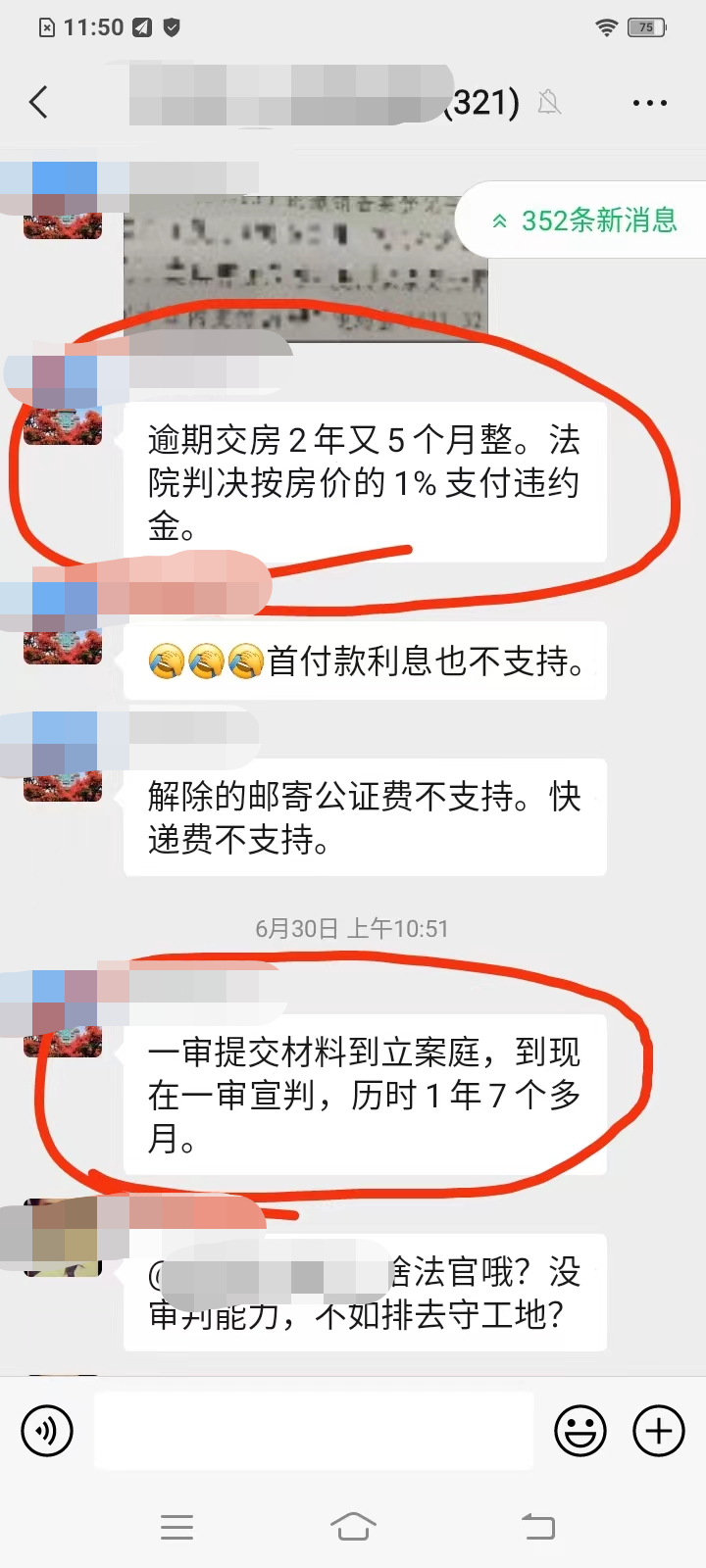 国务院行政法规《城市房地产开发经营管理条例》第三十二条规定,预售商品房的购买人应当自商品房交付使用之日起90日内,办理土地使用权变更和房屋所有权登记手续,房地产开发企业应当协助商品房购买人办理土地使用权变更和房屋所有权登记手续,并提供必要的证明文件。开发商提供的制式《购房合同》里,却用笔在“60”日办理房产证的前面加了一个“5”,原被60天办理房产证成了560天办理房产证。购房者买了房子八九年,一直没有拿到房产证,起诉到法院要求开发商承担逾期办证违约金,法院裁判,合同约定的560天才办理房产证,约定出于双方自愿,不违反法律规定,法院予以确认,双方应按照合同约定履行。别说逾期办证给购房者造成的诸多麻烦,无证房给社会造成多大的混乱,连国务院的行政法规,都压根不在法院的考量范围啊!按照法院的这个判法,开发商下次约定1560天才办房产证,是不是也是有效的?以上的种种真实裁判结果,不是个例,也不能概括全部,却真真切切的反映了,即使是在现在,某些法院在审理房产销售案件中,并没有摆明公平公正的立场,没有执行最高法院《商品房买卖合同司法解释》的规定,根本没有出于维护社会房地产秩序为目标审理具体案件。微信群里,有律师发出了自己代理的商品房销售案件的简况:![]()