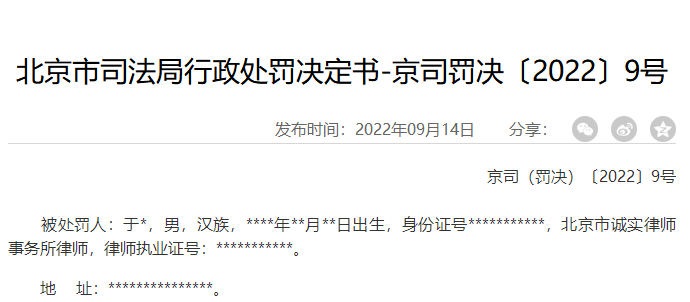 9月14日,北京市司法局官网公布了京司罚决〔2022〕9号《行政处罚决定书》,内容是一起律师因犯妨害作证罪吊销律师执业证的警示案例。