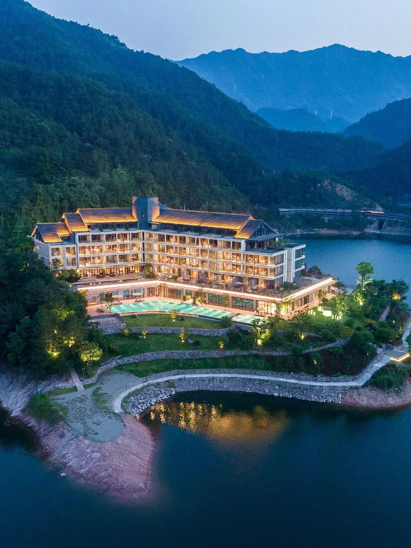 酒店在山色与湖光交映间,呈“人”字型的建筑形态,向客人传达“万物人为本” 的寓意,从千威线公路驶来,远远就可以看见这座“独具一格”的酒店,藏匿于山水之间的“徽派建筑“,入住体验感果然不一样!