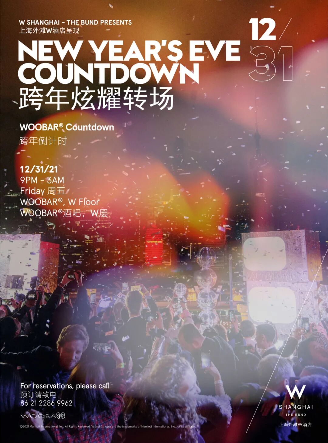相信不少人都看过《博物馆奇妙夜》这部经典影片,那么,夜间的美术馆又将是什么景象呢?12月31日,油罐艺术中心将呈现一个艺术不眠夜,当晚所有展览夜间开放,让你的2022拥有一个与众不同的艺术开场~今年的跨年夜,外滩三号的新年倒数派对势必又将吸引一票潮人玩咖!不仅有现场DJ和巡游表演,外滩三号还超贴心地提供了节日妆容服务和暖炉及保暖服饰,这下可以在露台放心大胆地蹦迪了!时间:2021.12.31 21:00-2022.1.1 2:00上海外滩W酒店今年推出的跨年炫耀转场可谓是把W的潮和时尚贯彻到2021年的最后一秒钟。除了酒店内的各种新年晚宴,W层的室内酒吧WOOBAR还将举办跨年倒计时派对,不用担心气氛够不够嗨,W的跨年派对就是嗨的代名词! 时间:2021.12.31 21:00-2022.1.1 3:00ALTER·风云人物跨年派对,将在今年的12月31日包揽上海艾迪逊酒店的7个空间,这也是迄今为止规模最大的ALTER.派对。合成器流行时代的经典Depeche Mode,嘻哈运动的A Tribe Called Quest,还有迪斯科年代的Donna Summer,20+组音乐人已准备好一整晚的律动~票价:半通票 预售699元 现场799元 (可进入4个空间,啤酒、葡萄酒和混合酒畅饮)全通票 预售999元 现场1199元(可进入全部7个空间,啤酒、葡萄酒、混合酒和美丽时光香槟畅饮)在冬季凭借绝美圣诞树收获超多话题热度的上海半岛酒店,也将在其艾利爵士酒吧举行跨年派对,不限量的香槟和小食,穿上优雅的年代感服饰(记住这是Dress code哦),在微醺中随着音乐摆动,小资感十足~上海金茂君悦大酒店将举行两大跨年盛典——位于酒店87层的九重天云端魔音倒计时跨年盛典和 56层的天庭经典倒计时跨年盛典。伴随着新年钟声,10000只气球将从33楼高的酒店中庭缓缓落下,犹如满载祝福的繁星落入凡尘。票价:298元(门票包含两种指定饮品),598元(门票包含玛姆畅饮香槟、葡萄酒、啤酒、软饮)上海浦东丽思卡尔顿酒店将在58层FLAIR顶层餐厅酒吧赴一场新年之约。除了现场DJ音乐表演,三种跨年套餐提供多种选择,其中的六人桌位为景观位,套餐内还包含精选海鲜,是一群好友一起跨年的不错选择!地点:上海市浦东新区陆家嘴世纪大道8号上海国金中心票价:酒水畅饮788元 香槟畅饮988元 六人桌位8888元上海环球凯越酒店的燃情跨年派对位于酒店47层的天际餐吧。等夜幕降临、星光摇曳,乐队将用现场演奏燃爆全场。再配上一杯特调鸡尾酒或馥郁香槟,一起在舞池中释放自我,挥别过去,奔向崭新!票价:早鸟价188元(含1杯香槟或2杯无酒精饮料) 388元(香槟畅饮)上海静安香格里拉的“香”遇奇迹新年倒数派对即将开场!晚上8点,派对正式拉开序幕。跨年特调让微醺恰到好处,当乐队歌声响起,DJ带来新年倒数,一起在人群中高呼“3,2,1!新年快乐!”