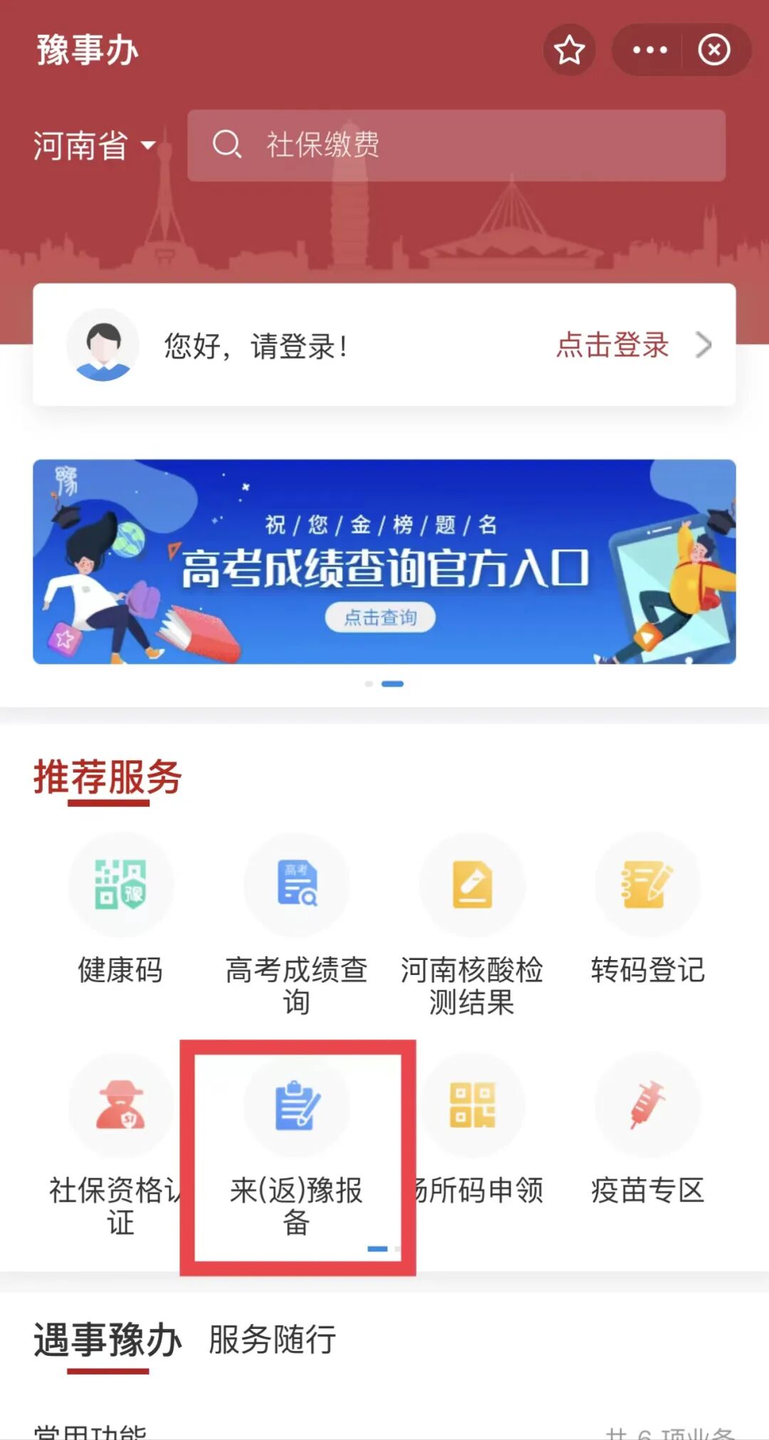 (一)安装豫事办APP、安馨办APP,进入支付宝“豫事办”小程序或扫描“来(返)豫报备”系统二维码进入“来(返)豫报备”系统社区报备入口,提前3天如实填写个人信息,完成报备登记。