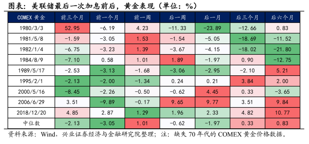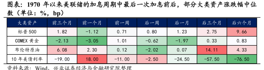 随着美国通胀确认下行拐点,美联储本轮加息周期也逐渐接近尾声。我们统计了70年代以来美联储历次加息周期中最后一次加息前后的大类资产表现:(1)随着加息周期结束,美股大概率快速上行,最后一次加息后6个月的涨跌幅中位数近10%;(2)最后一次加息前,黄金表现较差,加息周期结束后,黄金逐渐企稳;(3)最后一次加息前三个月和后三个月,布伦特原油期货涨幅较高;(4)加息周期结束后,10年期美债利率大概率快速回落。