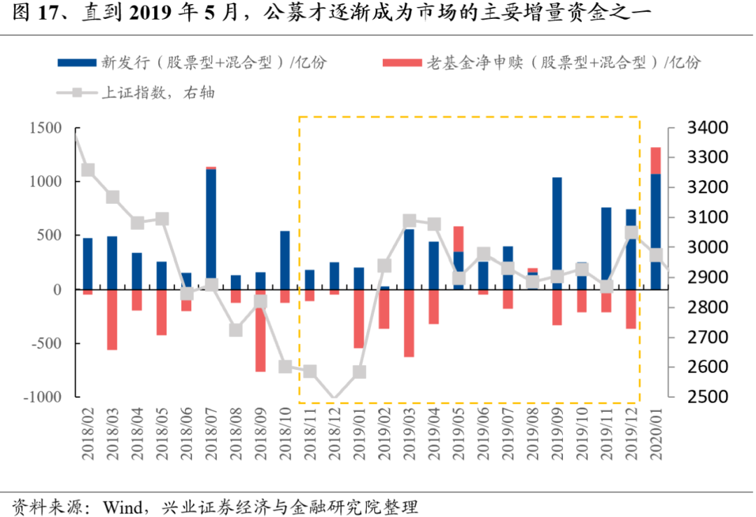 公募方面,尽管市场于2018年底已逐渐企稳,但新发规模的回暖滞后于市场底1个月左右,并且随着A股开始反弹,基金于2019年1-4月遭遇大幅赎回,因此公募基金在2019一季度、乃至上半年贡献的增量资金较少。直到5月份,随着市场回暖带动新发规模回暖,叠加赎回压力降低,公募才逐渐成为市场的主要增量资金之一。![]()