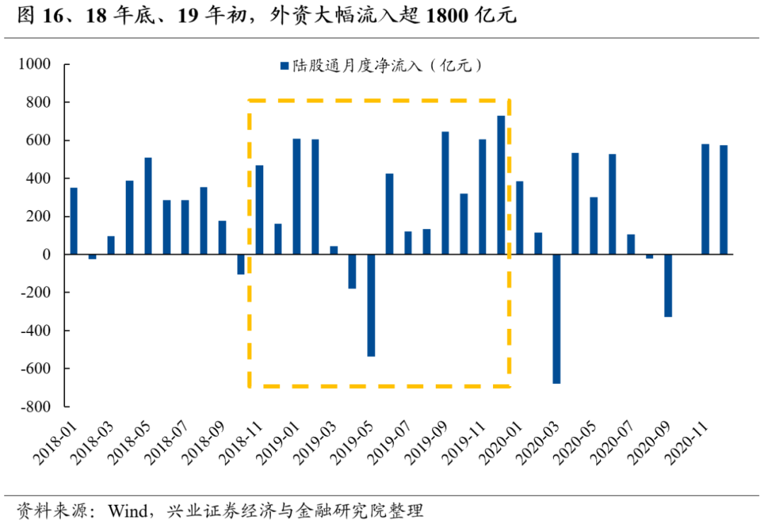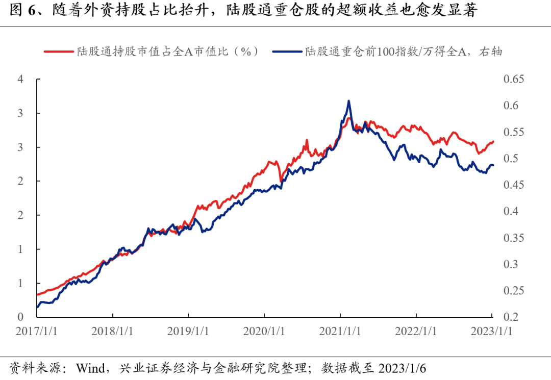 2022年11月以来,外资快速回流A股,对A股近期走势和风格轮动起到了重要推动,是近期市场的主导增量。去年11月11日起,外资逐渐开始回流A股,对应市场由下跌转为震荡上行,新年第一周更是加仓超200亿元,催化A股“开门红”。风格上,北上资金主要加仓大消费和大金融等板块,推动本轮核心资产回暖。(1)美元快速回落、人民币汇率快速升值。22年11月2日以来,美元兑人民币离岸汇率由7.34大幅升值至1月9日的6.78,升值幅度达8.21%,成为吸引本轮外资大幅流入的重要原因。(2)外资对中国经济的修复预期持续增强。随着国内疫情防控、地产以及互联网监管等重大政策优化调整,叠加宽松政策持续加码,中国主权CDS自高位显著回落,反映外资对国内经济的担忧已经明显缓解,推动北上资金大幅流入。(3)外资对国内的政策预期出现变化。近期中央持续强调对互联网平台企业的支持,扭转了外资对中国监管的预期,加强了海外投资者投资中国资产的信心。(4)美股进入磨底阶段,海外市场波动减小,外资风险偏好提升。自22年11月后,VIX指数明显回落并维持较低水平,外资风险偏好也出现提升,是推动本轮北上资金大幅流入A股的重要因素。2.1、2017-2019年,外资成为市场的主导性增量2017-2019年,随着陆股通机制逐渐完善、A股纳入MSCI,外资持股市值占A股比重快速提升,成为A股市场的主导资金。随着沪深港通开通,2017年A股成功闯关MSCI,外资流入开始提速,全年流入规模从2016年607亿大幅提升至1997亿;2018年-2019年,随着A股相继纳入国际三大指数,外资流入再上台阶,净流入规模达到2942亿、3517亿。增量资金决定市场风格,2017-2019年,“跟着外资买茅台”超额收益极为显著。2017-2018年,外资按照价值投资的理念大规模买入并重仓盈利稳定、ROE较高的消费白马和各行业龙头。随着外资加速流入、对A股定价权持续提升,以茅台为代表的外资重仓股取得了显著的超额收益。过去三年,随着国内机构投资者大幅扩张,内资定价权反超外资。2019年起,公募发行规模逐步抬升,2020年公募发行迎来爆发增长,偏股基金发行规模超过2万亿,占A股市值比例大幅提升2pct,成为A股市场最大增量,推动“茅指数”、“宁组合”等取得显著超额收益。2021年开始,私募规模快速攀升,也成为市场风格的重要塑造者。2022年,在系统性风险冲击下,外资、公募、私募占A股市值比例转为回落,市场并无明显主导资金,存量资金博弈下市场风格快速轮动。2.3、展望2023年,预计外资流入规模达3000亿元展望全年,随着内外扰动缓解,近期催化外资流入的积极因素仍将延续,预计北上资金仍将继续加仓A股,2023年全年有望为A股带来3000亿元左右的净增量。第一,全球流动性大趋势上逐步由紧转松,推动资金重新流向A股等新兴市场。随着美国通胀压力逐渐缓解,衰退压力日益增大的情况下,美联储加息接近尾声,全球流动性出现由紧转松的转折点,有利于资金流向中国等新兴市场。参考2018年底美联储结束降息、鲍威尔释放鸽派信号号,全球流动性压力边际缓解,2018年10月至2019年底,资金从发达市场流出超3800亿美元,流入新兴市场近330亿美元。第二,中国经济至少是底部弱复苏,美国经济则逐渐走向衰退,中国资产优势重现,人民币汇率也正在反转。中国方面,在中央强调扩大内需战略、防疫政策优化、地产政策接连发力,叠加政策维持宽松的背景之下,经济将逐渐迎来弱复苏。美国方面,在2022年超鹰派的加息之下,美国经济快速回落,今年有极高的概率走向衰退。中美基本面此消彼长的情形下,A股、人民币汇率等中国权益资产将重新占优,吸引外资加仓中国权益资产。![]()