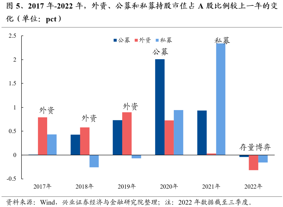 我们认为2023年外资较去年有望明显回流,或为市场贡献3000亿元的“弹药”,成为A股市场最重要的增量资金来源之一。2022年,在海内外风险冲击下,北上资金全年流入近900亿元左右,其中还出现过两次月度级别的大幅流出。但2023年外资流入有望回归常态,预计外资净流入规模有望回归至2019-2021年的平均水平,即3000亿元左右。并且,在2023年全球流动性由紧转松、中国资产优势重现的背景下,外资流入有可能更超预期。![]()