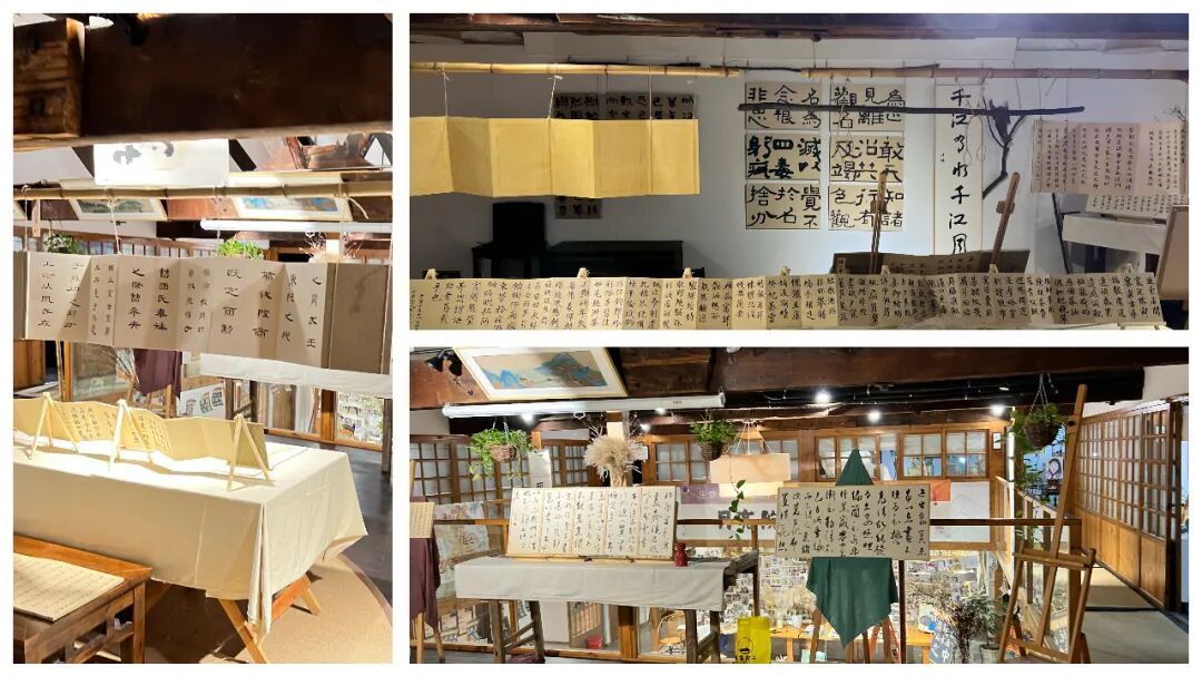书法展示区用得比较多的材料是麻绳和树枝还有竹竿,许多作品用悬挂的方式来展示,解决了展板不够用的问题,视觉上也比较空灵,符合二楼知非台的空间架构。