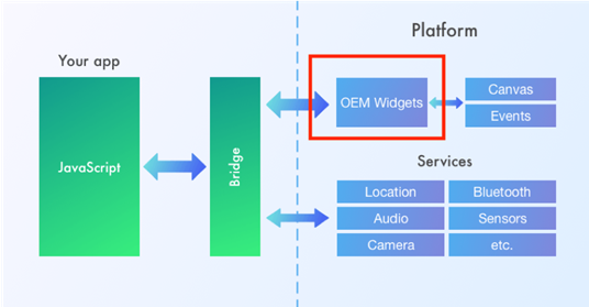 我们以React Native(下文简称RN)跨平台解决方案为例。在RN中,开发者使用JavaScript(JS)语言来开发,中间会有一层桥接层(Bridge),桥接层的主要作用就是提供一套完整的接口,使得JS代码可以直接使用移动端提供的UI组件和相关的API方法,并通过将这些组件进行组合,来最终实现整个页面的展示。