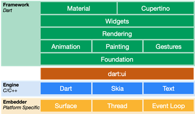 Flutter For Web和Flutter For Mobile的上层实现基本类似,但是在下层的实现有很大的差别。Flutter For Mobile中的绘制是使用了Engine中的Dart、Skia和Text,然后再调用iOS和Android提供的底层绘制能力来实现的。