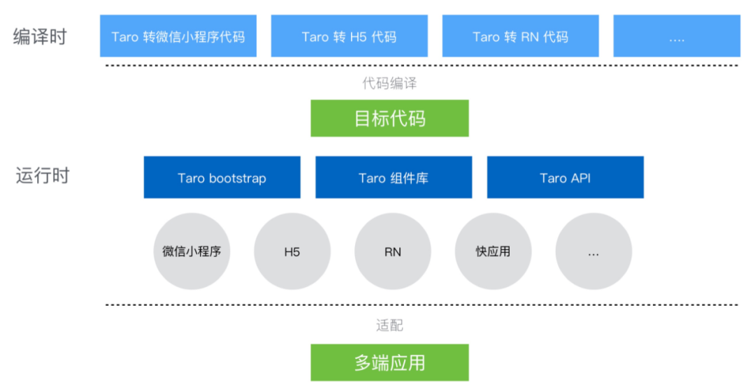 开发时遵循 React 语法标准,结合编译原理的思想,对代码文件进行一系列转换操作,最终获得可以在小程序运行的代码。而 React 最开始就是为了解决 Web 开发而生的,所以对代码稍加改动,也可以直接生成在 Web 端运行的代码,而同属 React 语法体系下的 React Native,也能够很便捷地提供支持。同理其他平台,如快应用、百度小程序等,将源码进行编译转换操作,也能获得该平台下的对应语法代码。