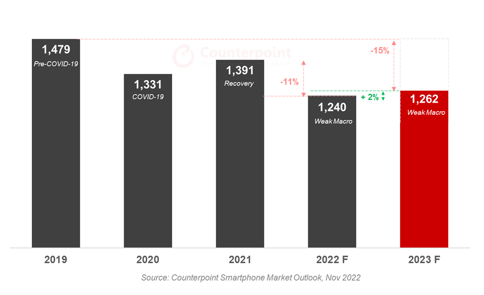 研究机构Counterpoint近日更新了市场展望,预测全球智能手机市场将在2023年实现2%的同比增长。但与该机构之前所预测的6%的增长相比有所下调,并且,该机构预计2023年上半年市场表现将继续低迷,直到第三季度才开始增长。