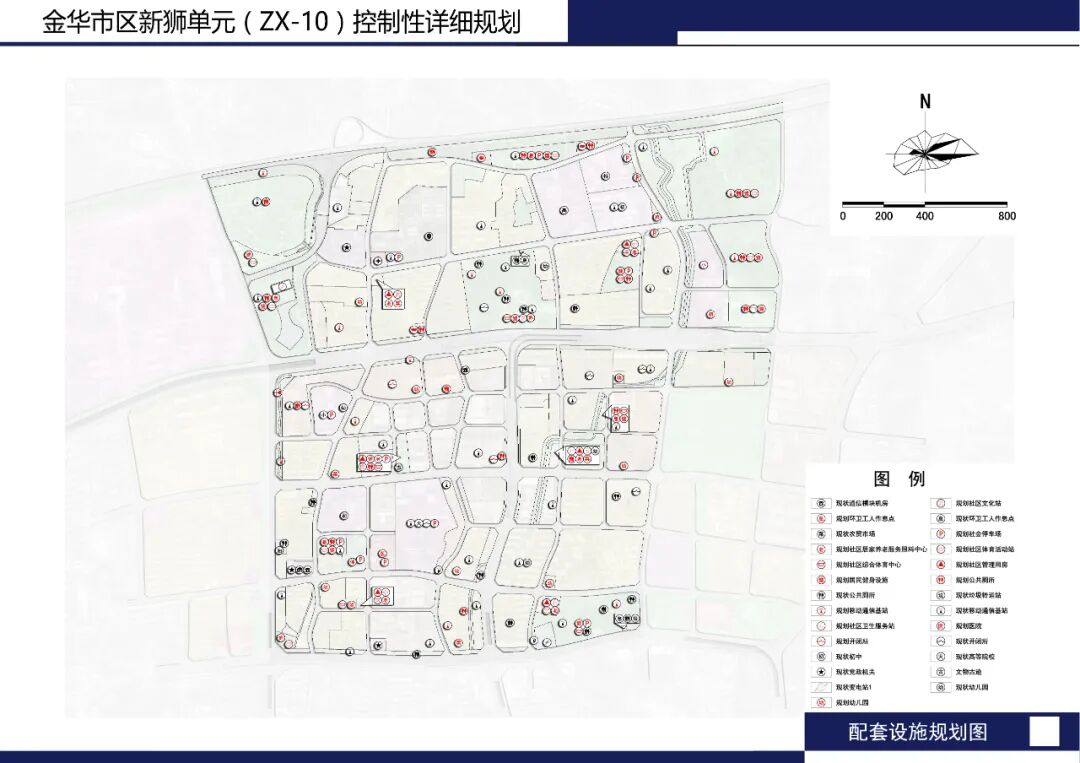 规划保留新狮街道办事处、婺北人民法庭、科贸学院、环城二小、四中玉泉校区,新狮街道社区卫生服务中心、金华市委党校、金华市特殊教育中心、金华六中、浙师大婺州外国语学校、何炳松墓,规划新建城北医院、体育中心,规划用地面积53.29公顷,占规划城市建设用地的9.82%。