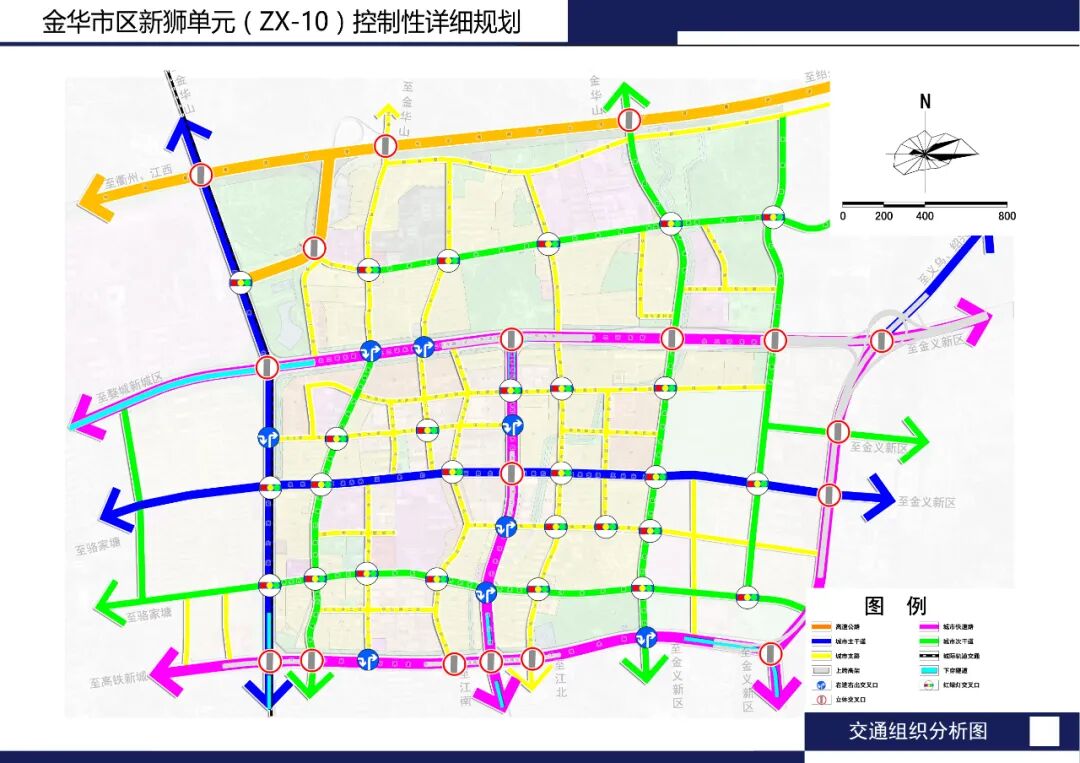 在衔接上位规划及道路专项规划的基础上,形成便捷通达的主次干路网络。环城北路:红线宽度73米,为快速路;北二环路红线宽度80米,为快速路;迎宾大道红线宽度63米,为主干路;东市北街红线宽度50米,为快速路;玉泉东路红线宽度40米,为主干路;冰壶路(次干路)向东延伸,红线宽度30米;丹光东路红线宽度拓宽为30米,为次干路;金盆街红线宽度30米,为次干路;芙峰街红线宽度拓宽为24米,为次干路;拓宽道院街、新业街、东升街,红线宽度分别为20米、16米、20米。[A2] 规划区内黄线包括110kV变电站(北郊变、对岳变)2座、垃圾转运站2座、通信模块机房,消防站、高速公路管理处、加油站、公交首末站,黄线控制面积4.13公顷。橙线主要为保留新狮街道办事处、婺北人民法庭、科贸学院、环城二小、四中玉泉校区、金华市委党校、新狮街道社区卫生服务中心、金华六中、金华市特殊教育中心、婺州外国语学校,规划新建城北医院、体育中心、服务设施综合体、城北小学、城北初中、幼儿园。橙线控制面积58.18公顷。绿线主要包括现状的环北公园,城北公园,朝真公园,沿通园溪、回溪两侧公园,并新增多处街头公园;防护绿地主要为杭金衢高速公路、北二环东路及环城北路沿线防护绿带,杭金衢高速公路防护绿地按后退道路红线50米设置(已建成区域按实际预留控制),沿北二环东路、环城北路沿线控制20米宽绿地。绿线控制面积130.14公顷。蓝线包括通园溪、回溪及接力塘水库,水域水面宽度保持现状不变。蓝线控制面积5.65公顷。