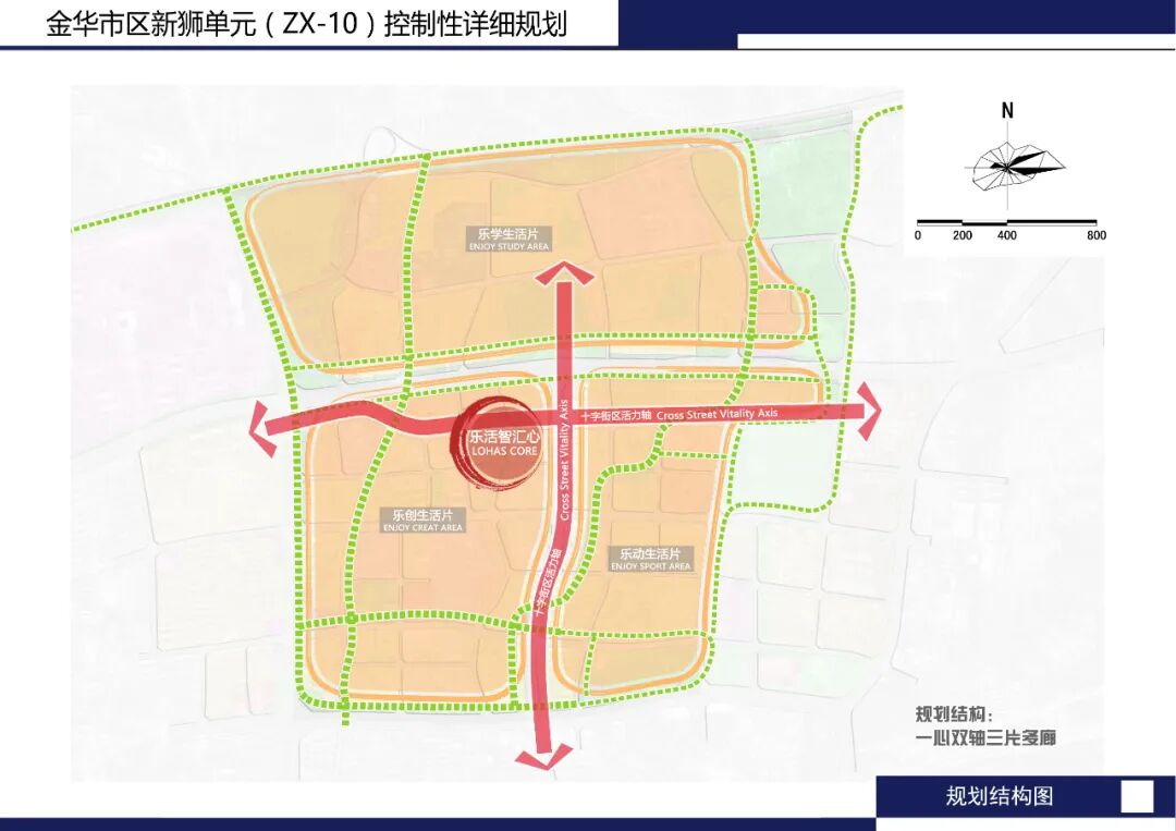 规划形成“十字活力街区、漫步绿脉网络、三坊主题生活”的空间结构。